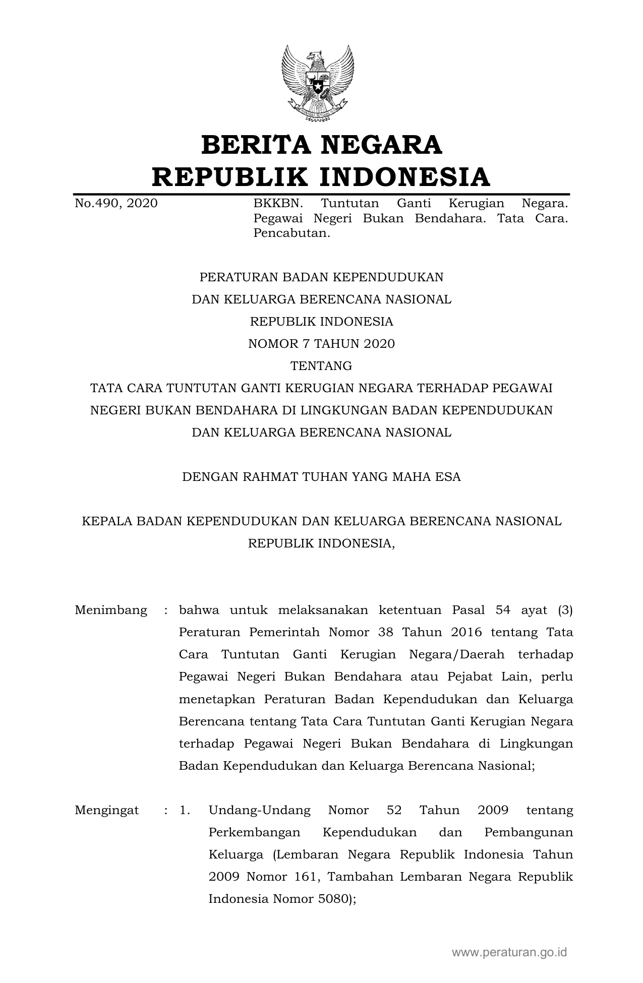 PERBAN Nomor 7 Tahun 2020 | Peraturan Badan Nomor 7 Tahun 2020 tentang TATA CARA TUNTUTAN GANTI KERUGIAN NEGARA TERHADAP PEGAWAI NEGERI BUKAN BENDAHARA DI LINGKUNGAN BADAN KEPENDUDUKAN DAN KELUARGA BERENCANA NASIONAL