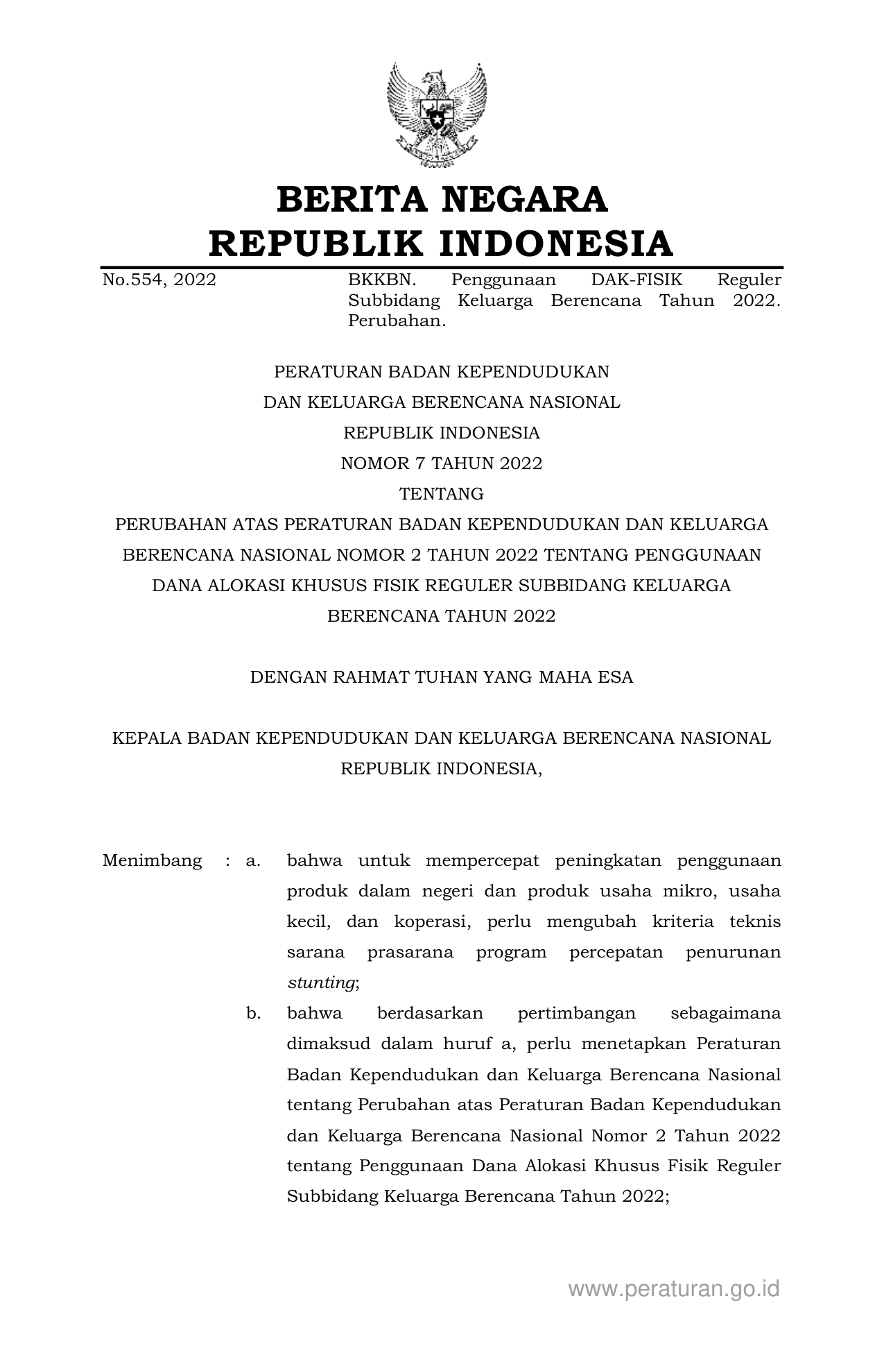 NOMOR 7 TAHUN 2022 TENTANG PERUBAHAN ATAS PERATURAN BADAN KEPENDUDUKAN DAN KELUARGA BERENCANA NASIONAL NOMOR 2 TAHUN 2022 TENTANG PENGGUNAAN DANA ALOKASI KHUSUS FISIK REGULER SUBBIDANG KELUARGA BERENCANA TAHUN 2022.