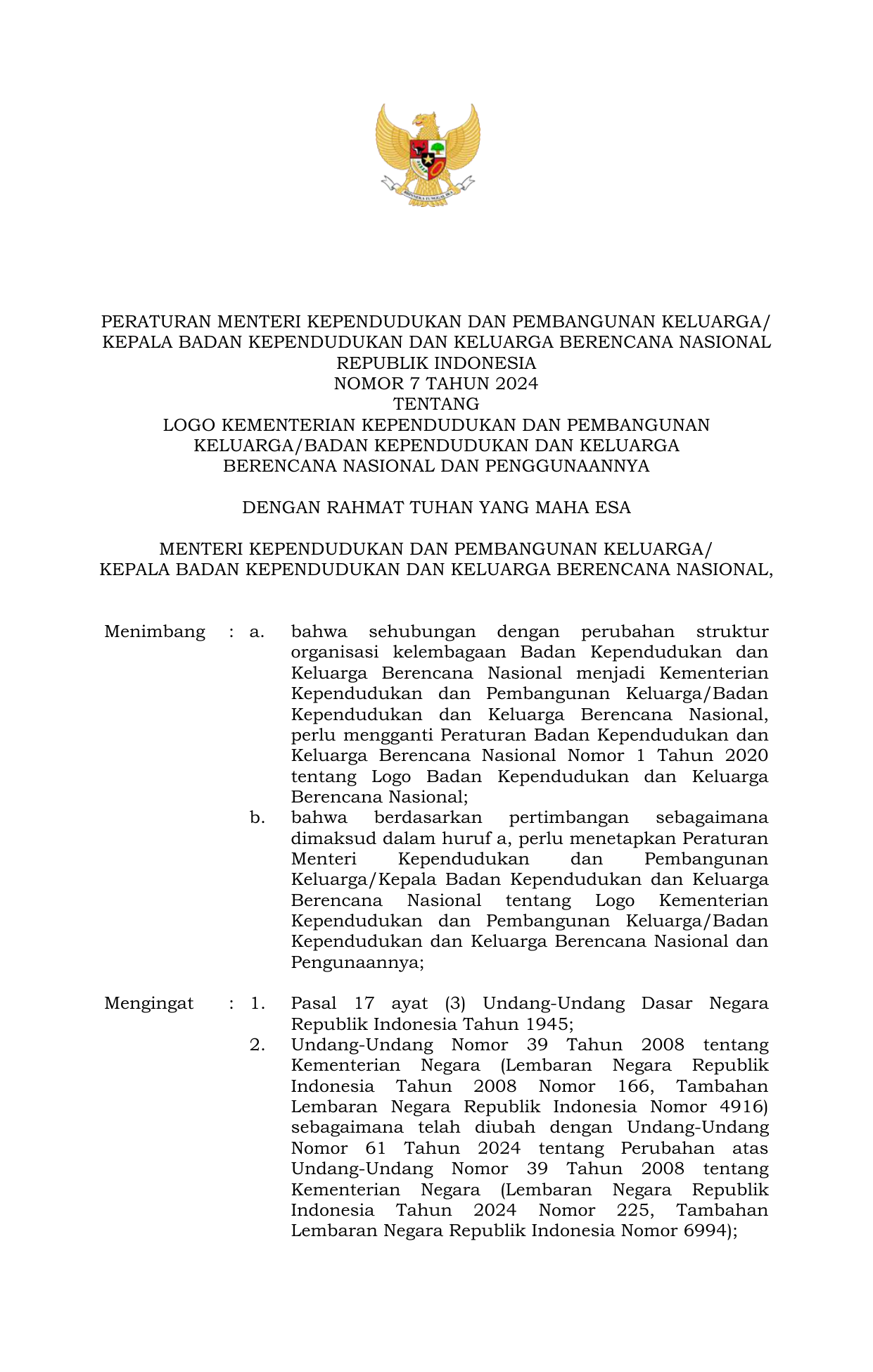 PERBAN Nomor 7 Tahun 2024 | Peraturan Badan Nomor 7 Tahun 2024 tentang LOGO KEMENTERIAN KEPENDUDUKAN DAN PEMBANGUNAN KELUARGA/BADAN KEPENDUDUKAN DAN KELUARGA BERENCANA NASIONAL