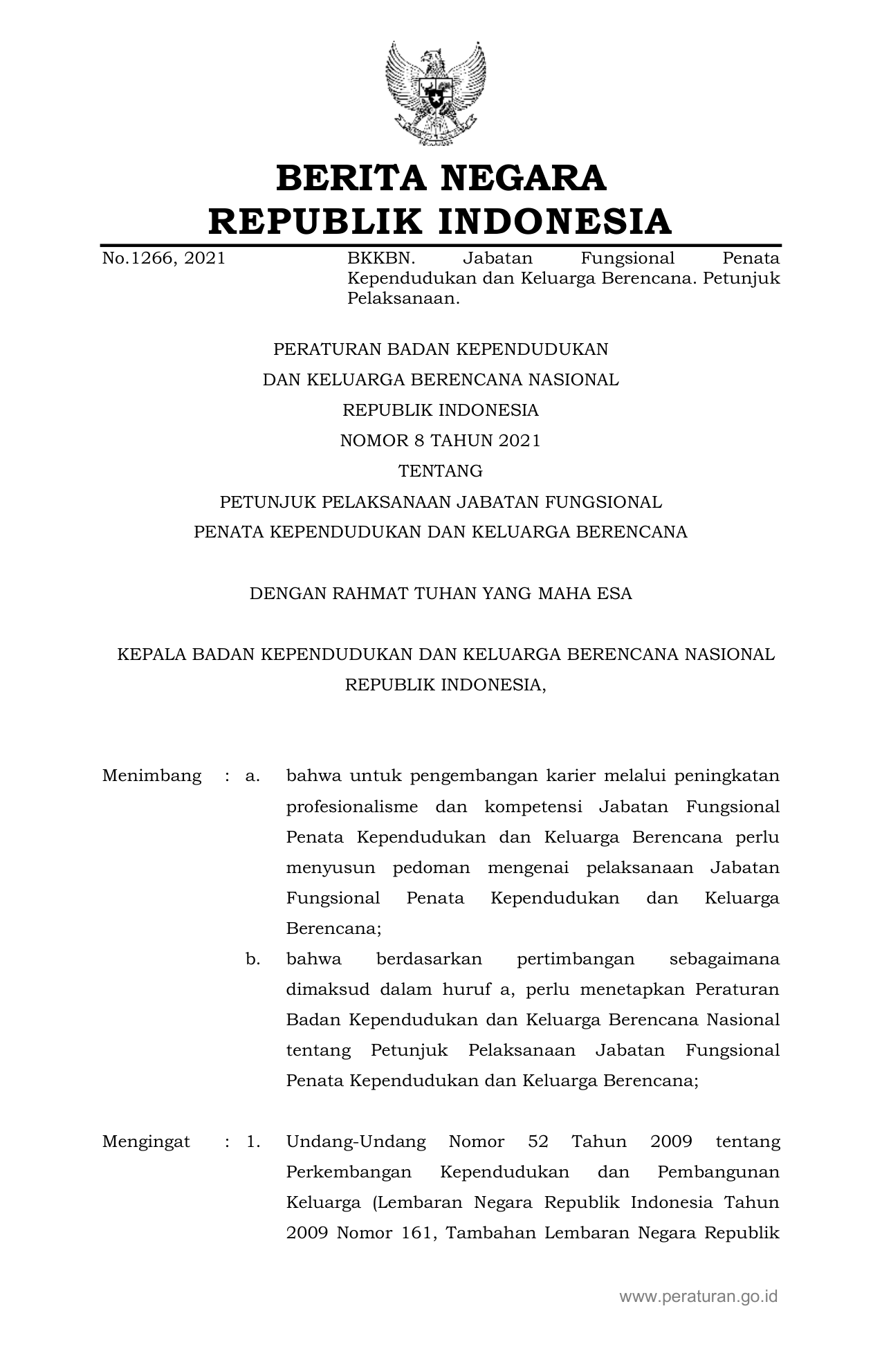 PERBAN Nomor 8 Tahun 2021 | Peraturan Badan Nomor 8 Tahun 2021 tentang PETUNJUK PELAKSANAAN JABATAN FUNGSIONAL PENATA KEPENDUDUKAN DAN KELUARGA BERENCANA