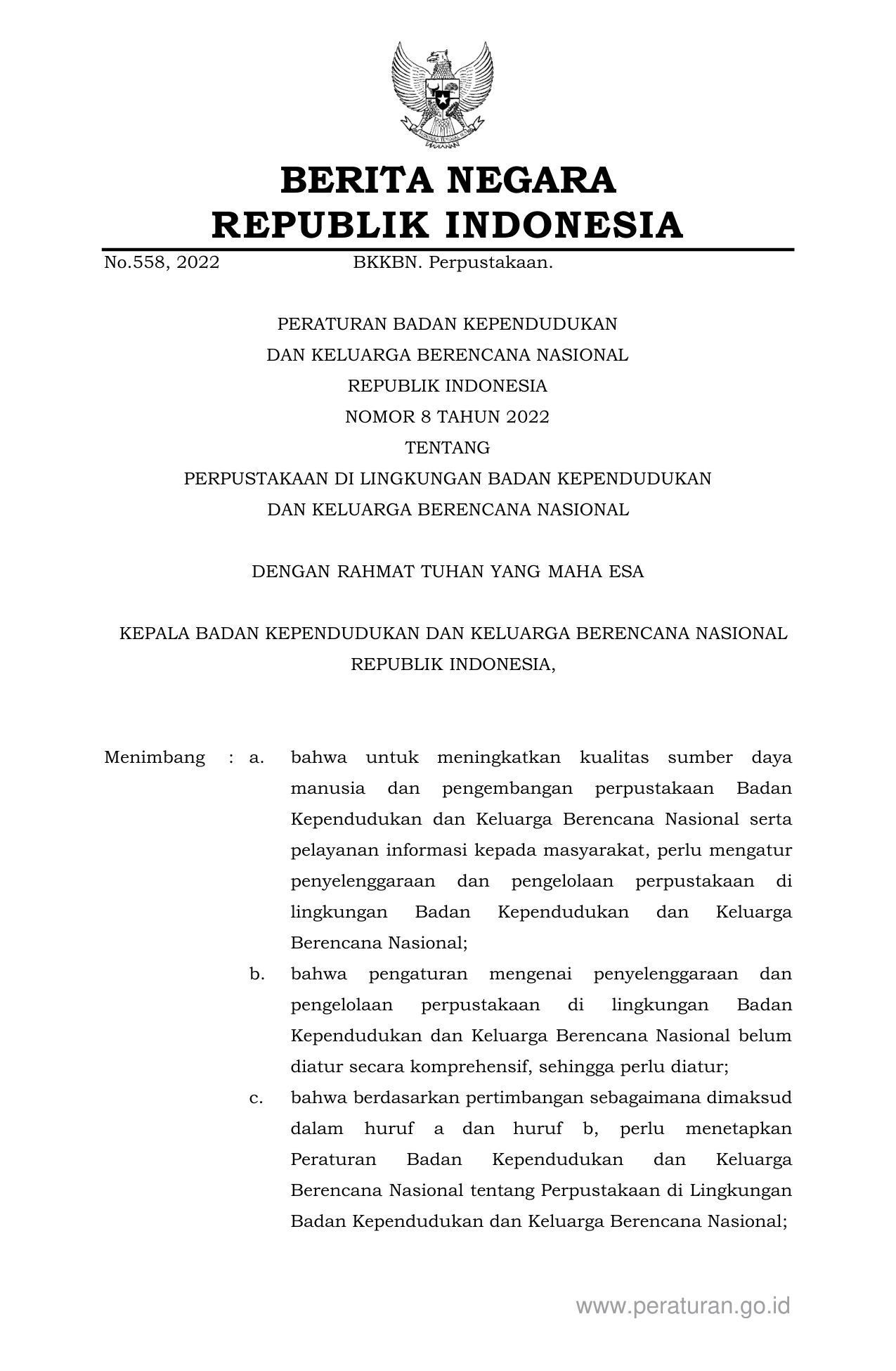 PERBAN Nomor 8 Tahun 2022 | Peraturan Badan Nomor 8 Tahun 2022 tentang PERPUSTAKAAN DI LINGKUNGAN BADAN KEPENDUDUKAN DAN KELUARGA BERENCANA NASIONAL