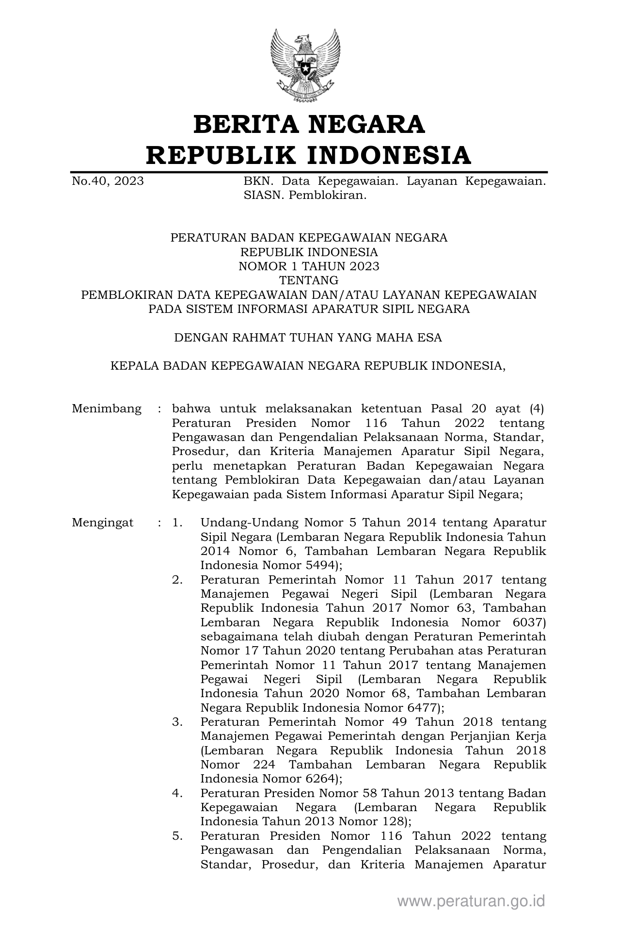 PERBAN Nomor 1 Tahun 2023 | Peraturan Badan Nomor 1 Tahun 2023 tentang PEMBLOKIRAN DATA KEPEGAWAIAN DAN/ATAU LAYANAN KEPEGAWAIAN PADA SISTEM INFORMASI APARATUR SIPIL NEGARA