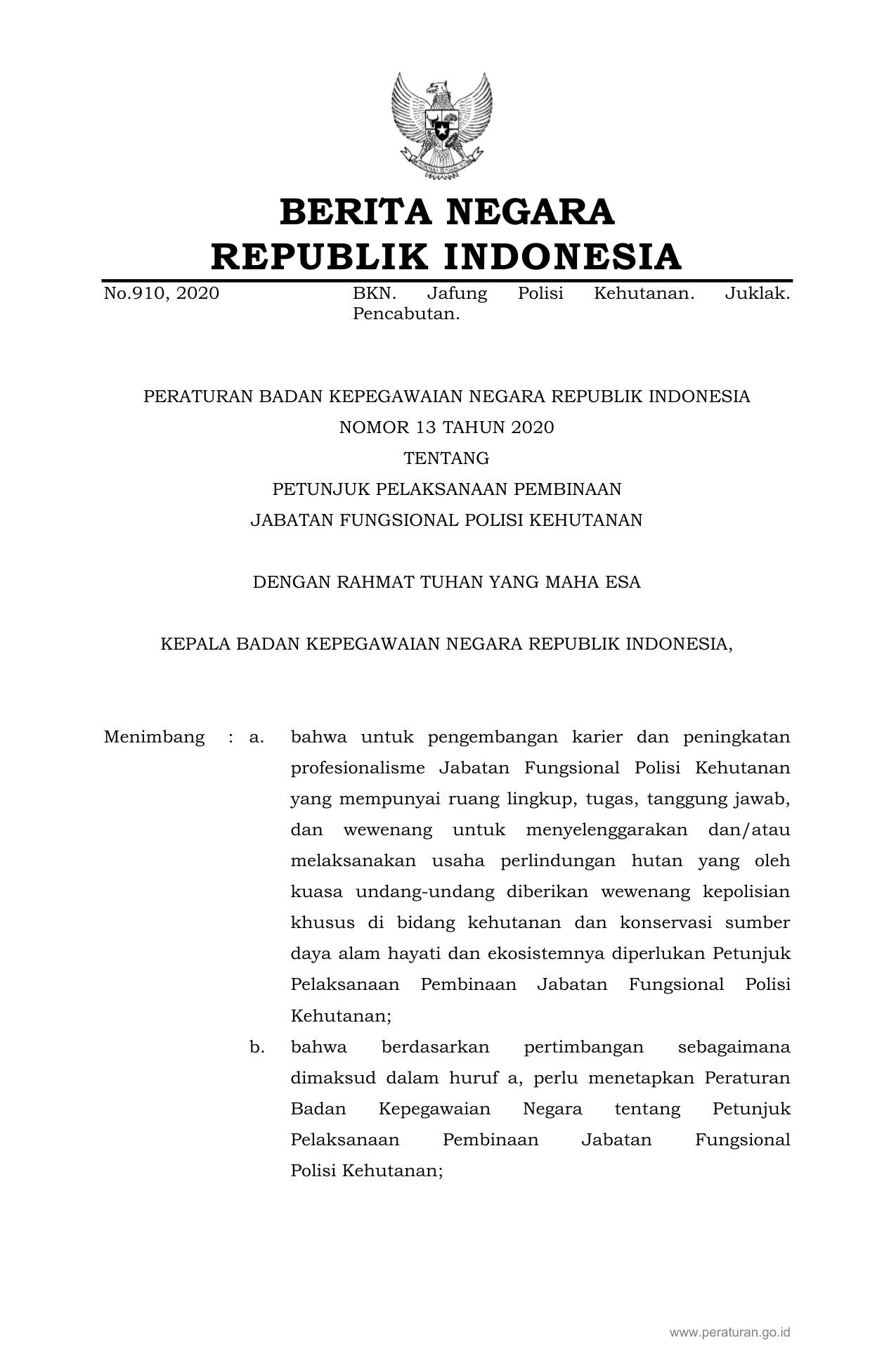 PERBAN Nomor 13 Tahun 2020 | Peraturan Badan Nomor 13 Tahun 2020 tentang PETUNJUK PELAKSANAAN PEMBINAAN JABATAN FUNGSIONAL POLISI KEHUTANAN