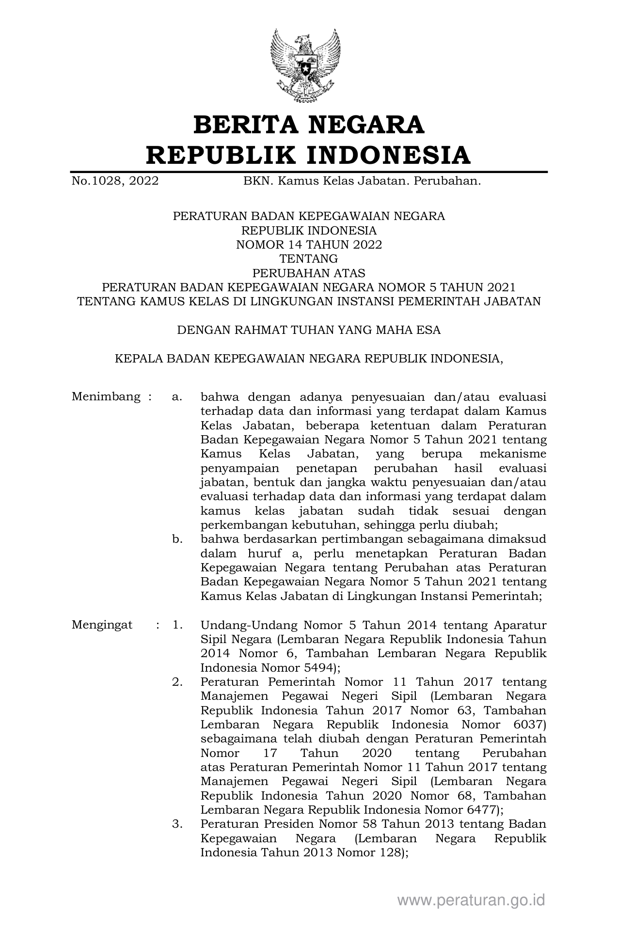 PERBAN Nomor 14 Tahun 2022 | Peraturan Badan Nomor 14 Tahun 2022 tentang PERUBAHAN ATAS PERATURAN BADAN KEPEGAWAIAN NEGARA NOMOR 5 TAHUN 2021 TENTANG KAMUS KELAS DI LINGKUNGAN INSTANSI PEMERINTAH JABATAN