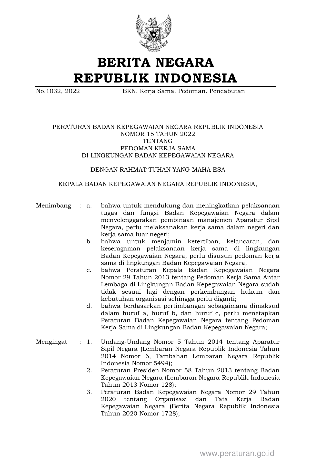 PERBAN Nomor 15 Tahun 2022 | Peraturan Badan Nomor 15 Tahun 2022 tentang PEDOMAN KERJA SAMA DI LINGKUNGAN BADAN KEPEGAWAIAN NEGARA