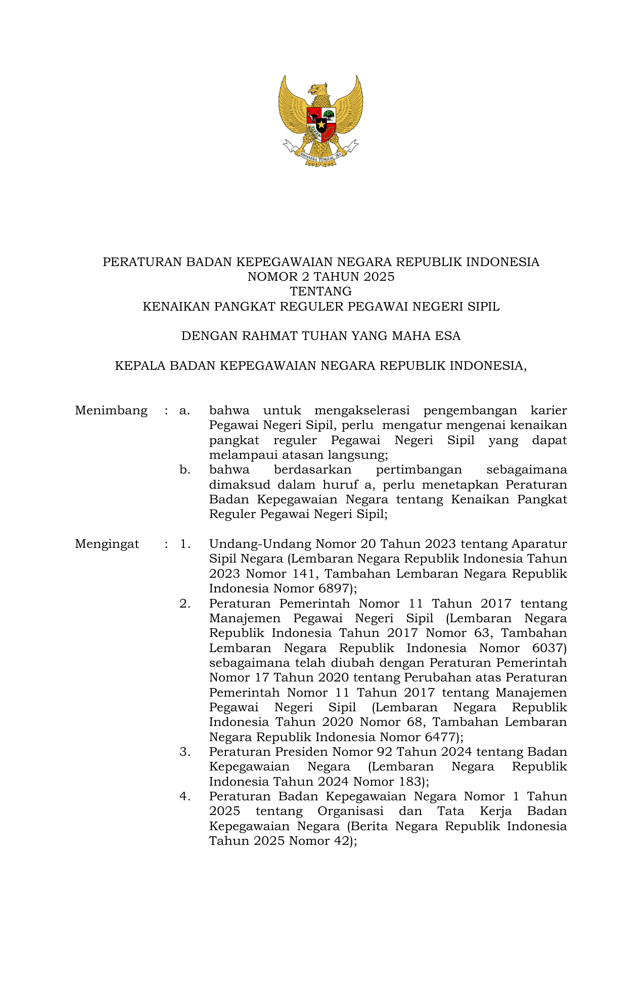 PERBAN Nomor 2 Tahun 2025 | Peraturan Badan Nomor 2 Tahun 2025 tentang KENAIKAN PANGKAT REGULER PEGAWAI NEGERI SIPIL