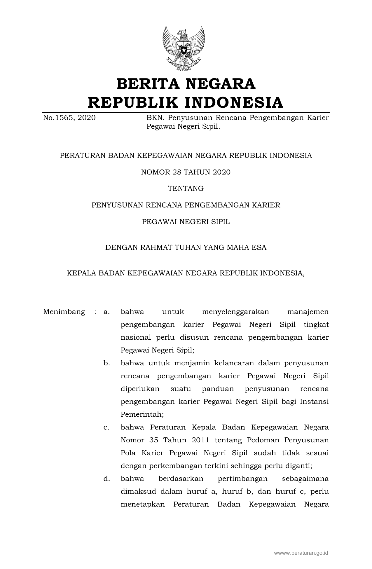 PERBAN Nomor 28 Tahun 2020 | Peraturan Badan Nomor 28 Tahun 2020 tentang PENYUSUNAN RENCANA PENGEMBANGAN KARIER PEGAWAI NEGERI SIPIL