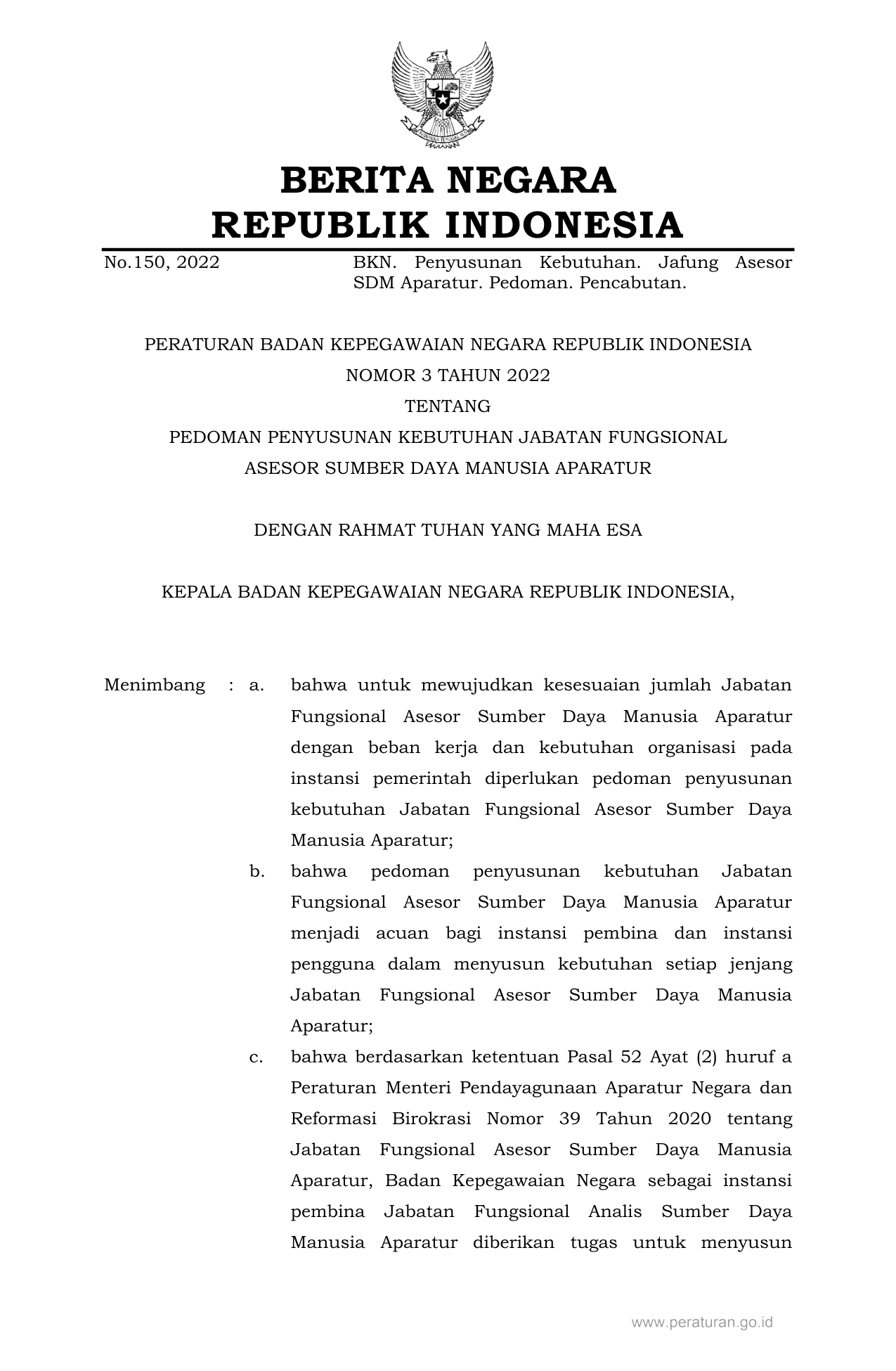 PERBAN Nomor 3 Tahun 2022 | Peraturan Badan Nomor 3 Tahun 2022 tentang PEDOMAN PENYUSUNAN KEBUTUHAN JABATAN FUNGSIONAL ASESOR SUMBER DAYA MANUSIA APARATUR