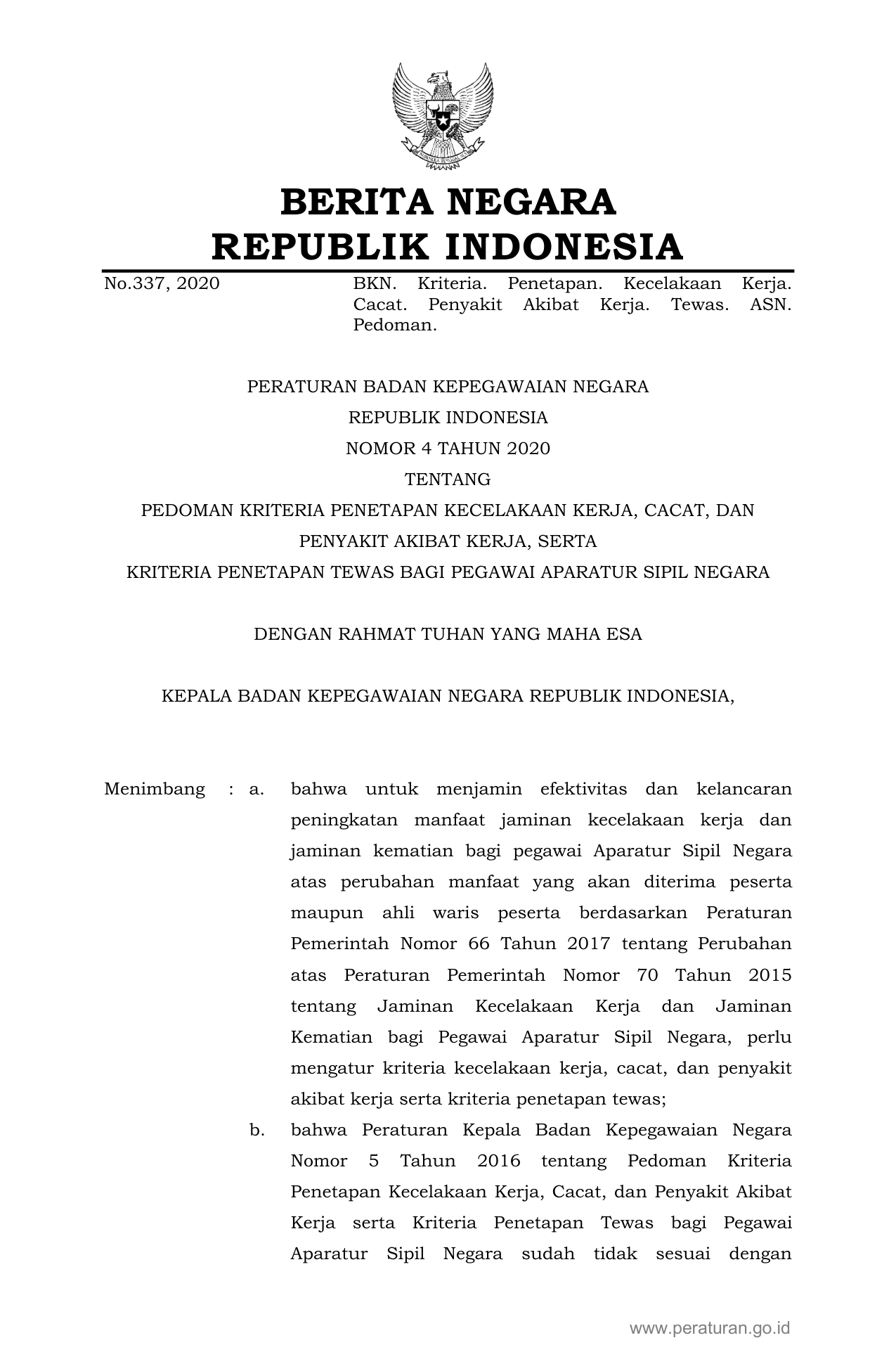 PERBAN Nomor 4 Tahun 2020 | Peraturan Badan Nomor 4 Tahun 2020 tentang PEDOMAN KRITERIA PENETAPAN KECELAKAAN KERJA, CACAT, DAN PENYAKIT AKIBAT KERJA, SERTA KRITERIA PENETAPAN TEWAS BAGI PEGAWAI APARATUR SIPIL NEGARA