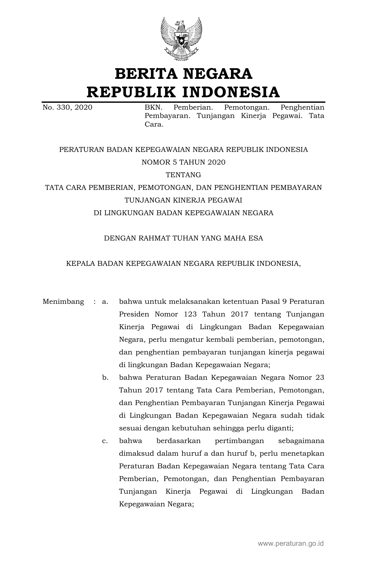 PERBAN Nomor 5 Tahun 2020 | Peraturan Badan Nomor 5 Tahun 2020 tentang TATA CARA PEMBERIAN, PEMOTONGAN, DAN PENGHENTIAN PEMBAYARAN TUNJANGAN KINERJA PEGAWAI DI LINGKUNGAN BADAN KEPEGAWAIAN NEGARA