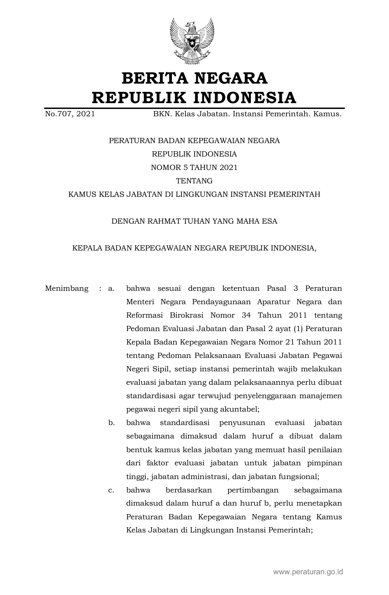 PERBAN Nomor 5 Tahun 2021 | Peraturan Badan Nomor 5 Tahun 2021 tentang KAMUS KELAS JABATAN DI LINGKUNGAN INSTANSI PEMERINTAH