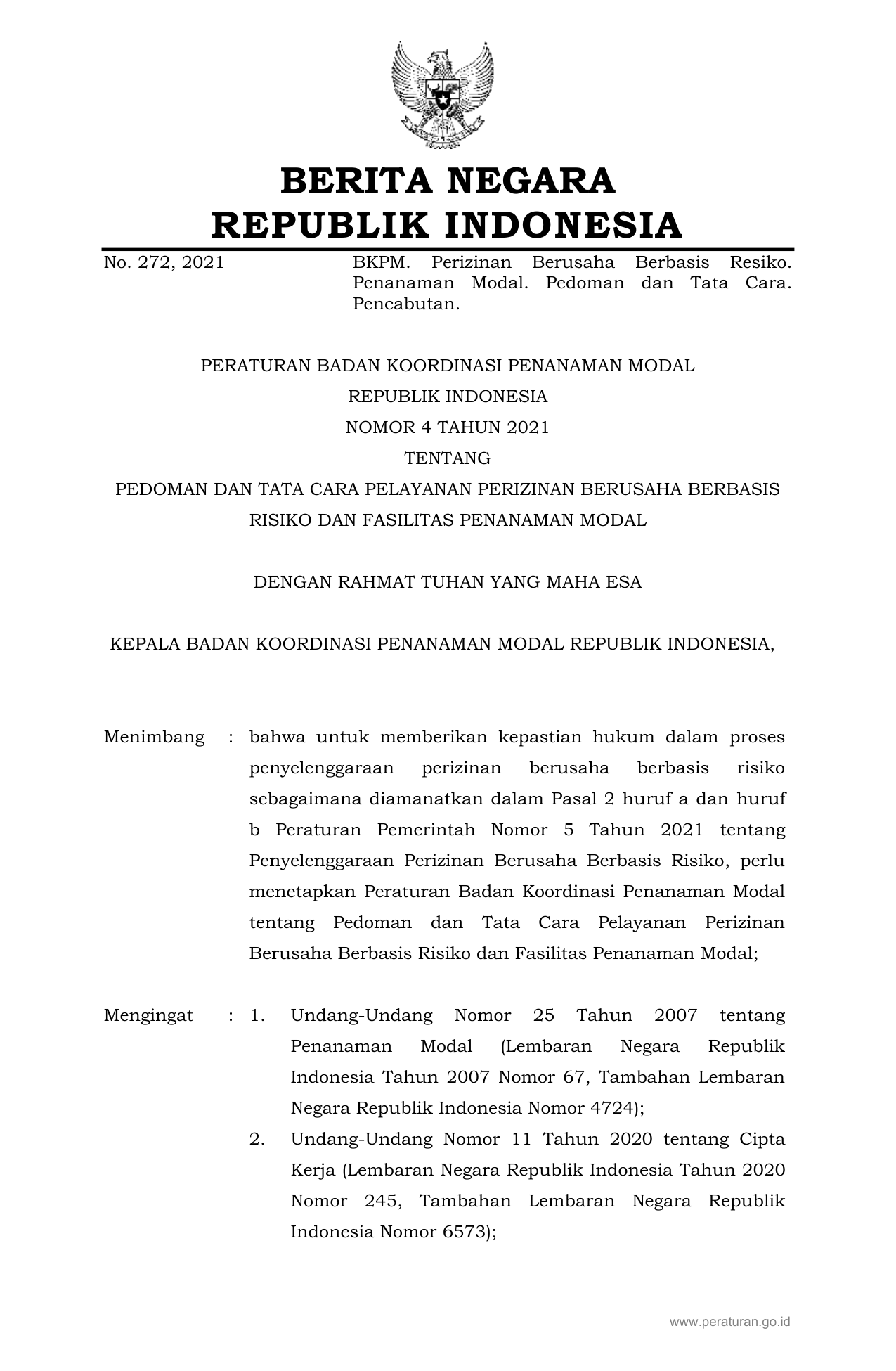 PERBAN Nomor 4 Tahun 2021 | Peraturan Badan Nomor 4 Tahun 2021 tentang PEDOMAN DAN TATA CARA PELAYANAN PERIZINAN BERUSAHA BERBASIS RISIKO DAN FASILITAS PENANAMAN MODAL