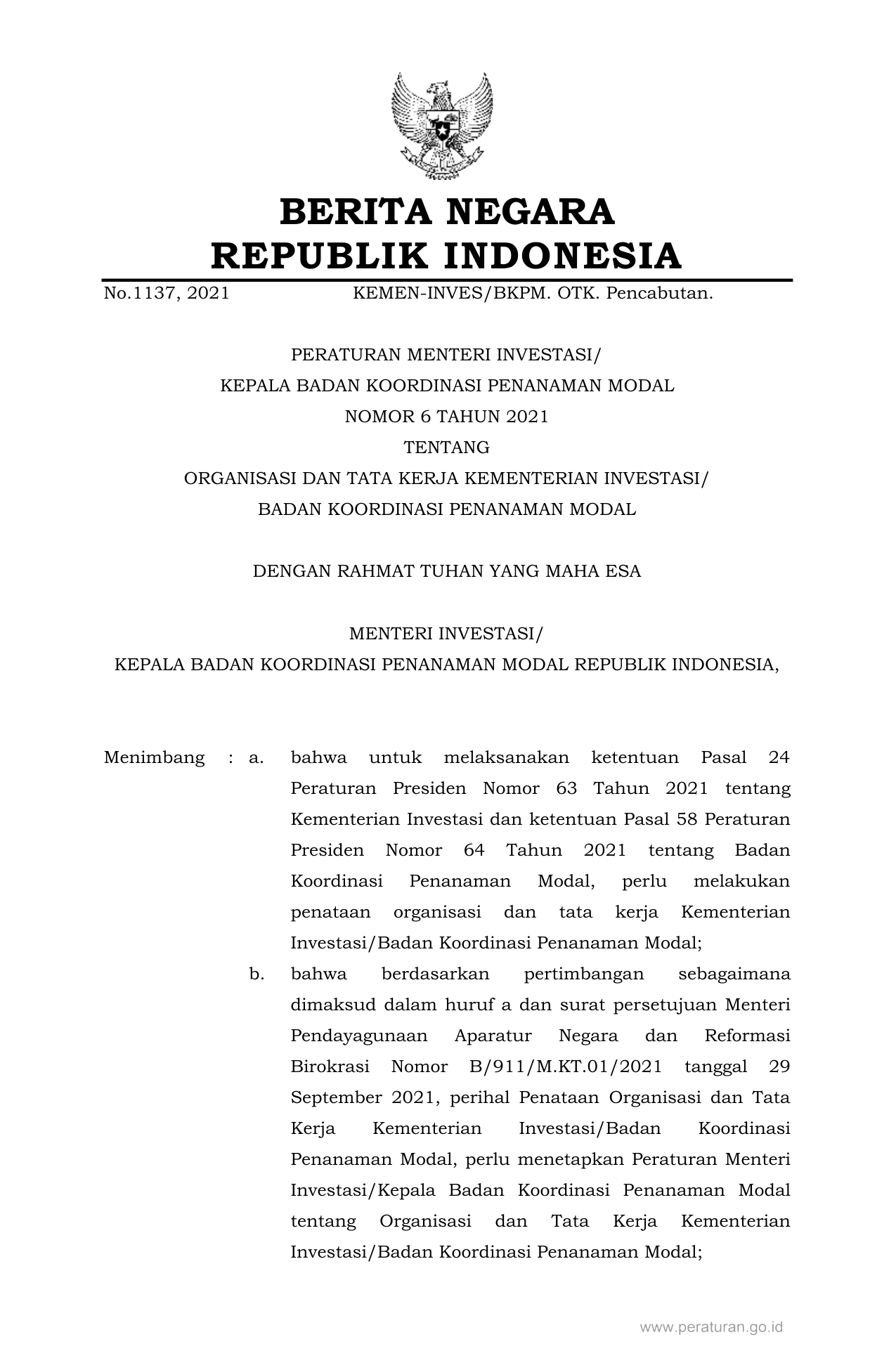 PERBAN Nomor 6 Tahun 2021 | Peraturan Badan Nomor 6 Tahun 2021 tentang ORGANISASI DAN TATA KERJA KEMENTERIAN INVESTASI/BADAN KOORDINASI PENANAMAN MODAL