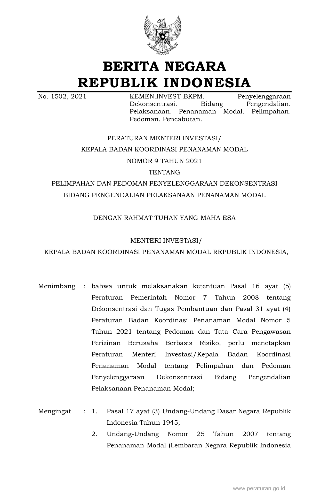 PERBAN Nomor 9 Tahun 2021 | Peraturan Badan Nomor 9 Tahun 2021 tentang PELIMPAHAN DAN PEDOMAN PENYELENGGARAAN DEKONSENTRASI BIDANG PENGENDALIAN PELAKSANAAN PENANAMAN MODAL