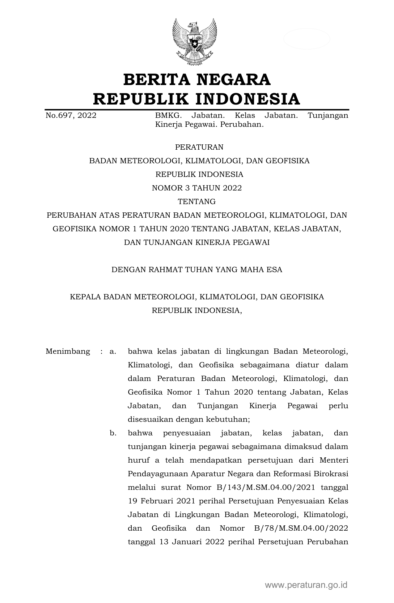 PERBAN Nomor 3 Tahun 2022 | Peraturan Badan Nomor 3 Tahun 2022 tentang PERUBAHAN ATAS PERATURAN BADAN METEOROLOGI, KLIMATOLOGI, DAN GEOFISIKA NOMOR 1 TAHUN 2020 TENTANG JABATAN, KELAS JABATAN, DAN TUNJANGAN KINERJA PEGAWAI