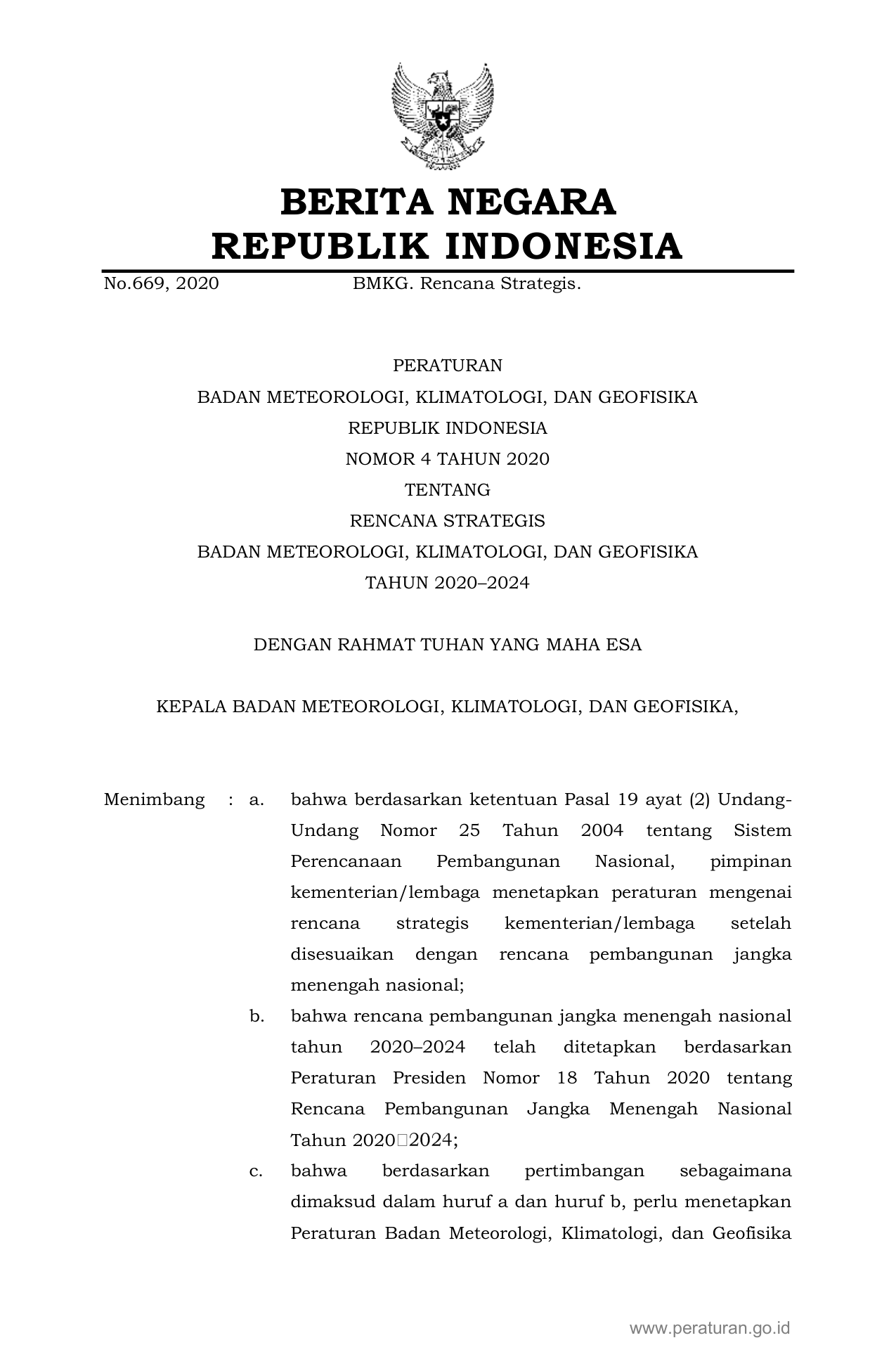 PERBAN Nomor 4 Tahun 2020 | Peraturan Badan Nomor 4 Tahun 2020 tentang RENCANA STRATEGIS BADAN METEOROLOGI, KLIMATOLOGI, DAN GEOFISIKA TAHUN 2020–2024