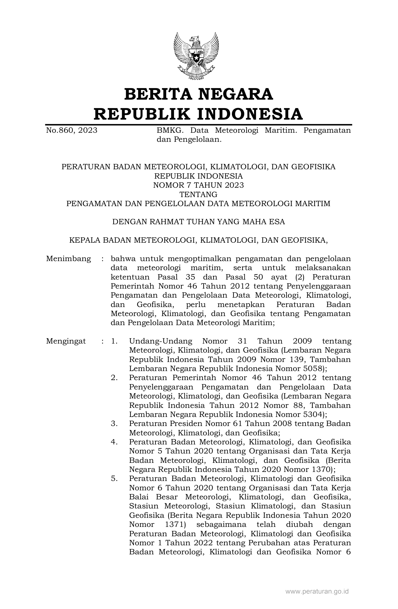 PERBAN Nomor 7 Tahun 2023 | Peraturan Badan Nomor 7 Tahun 2023 tentang PENGAMATAN DAN PENGELOLAAN DATA METEOROLOGI MARITIM