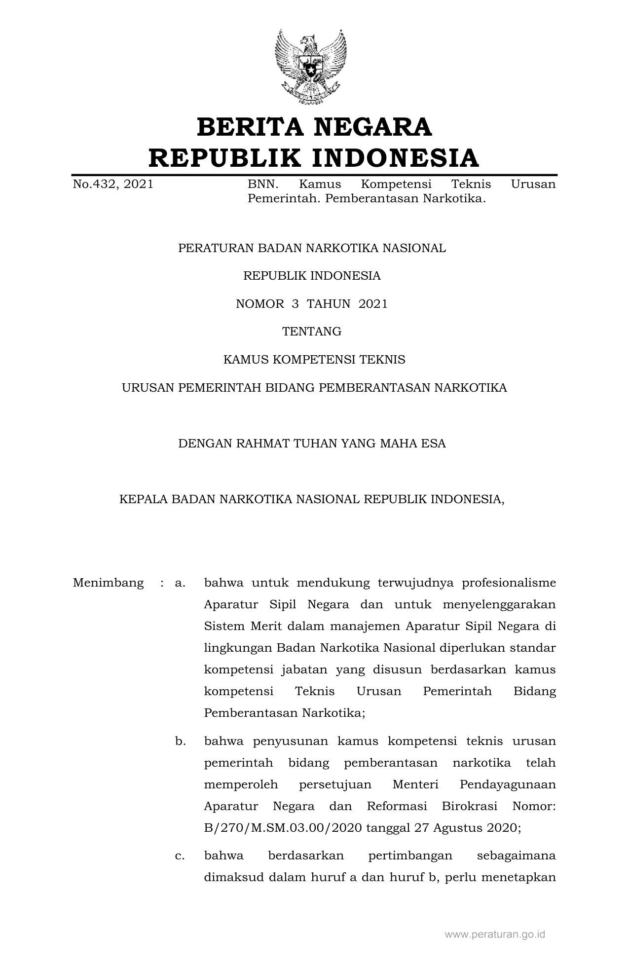 PERBAN Nomor 3 Tahun 2021 | Peraturan Badan Nomor 3 Tahun 2021 tentang KAMUS KOMPETENSI TEKNIS URUSAN PEMERINTAH BIDANG PEMBERANTASAN NARKOTIKA