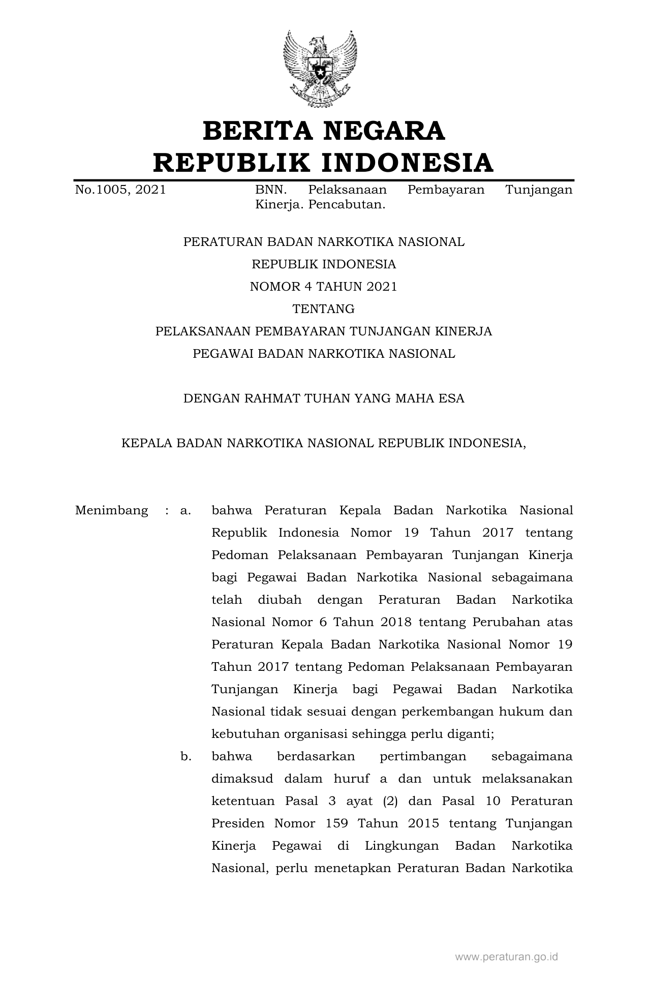 PERBAN Nomor 4 Tahun 2021 | Peraturan Badan Nomor 4 Tahun 2021 tentang PELAKSANAAN PEMBAYARAN TUNJANGAN KINERJA PEGAWAI BADAN NARKOTIKA NASIONAL
