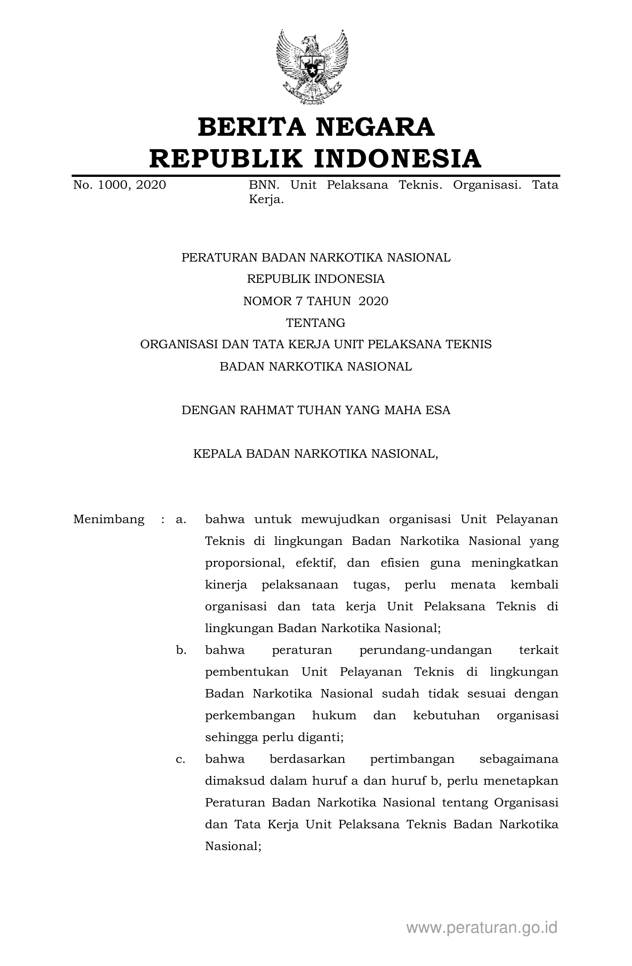 PERBAN Nomor 7 Tahun 2020 | Peraturan Badan Nomor 7 Tahun 2020 tentang ORGANISASI DAN TATA KERJA UNIT PELAKSANA TEKNIS BADAN NARKOTIKA NASIONAL