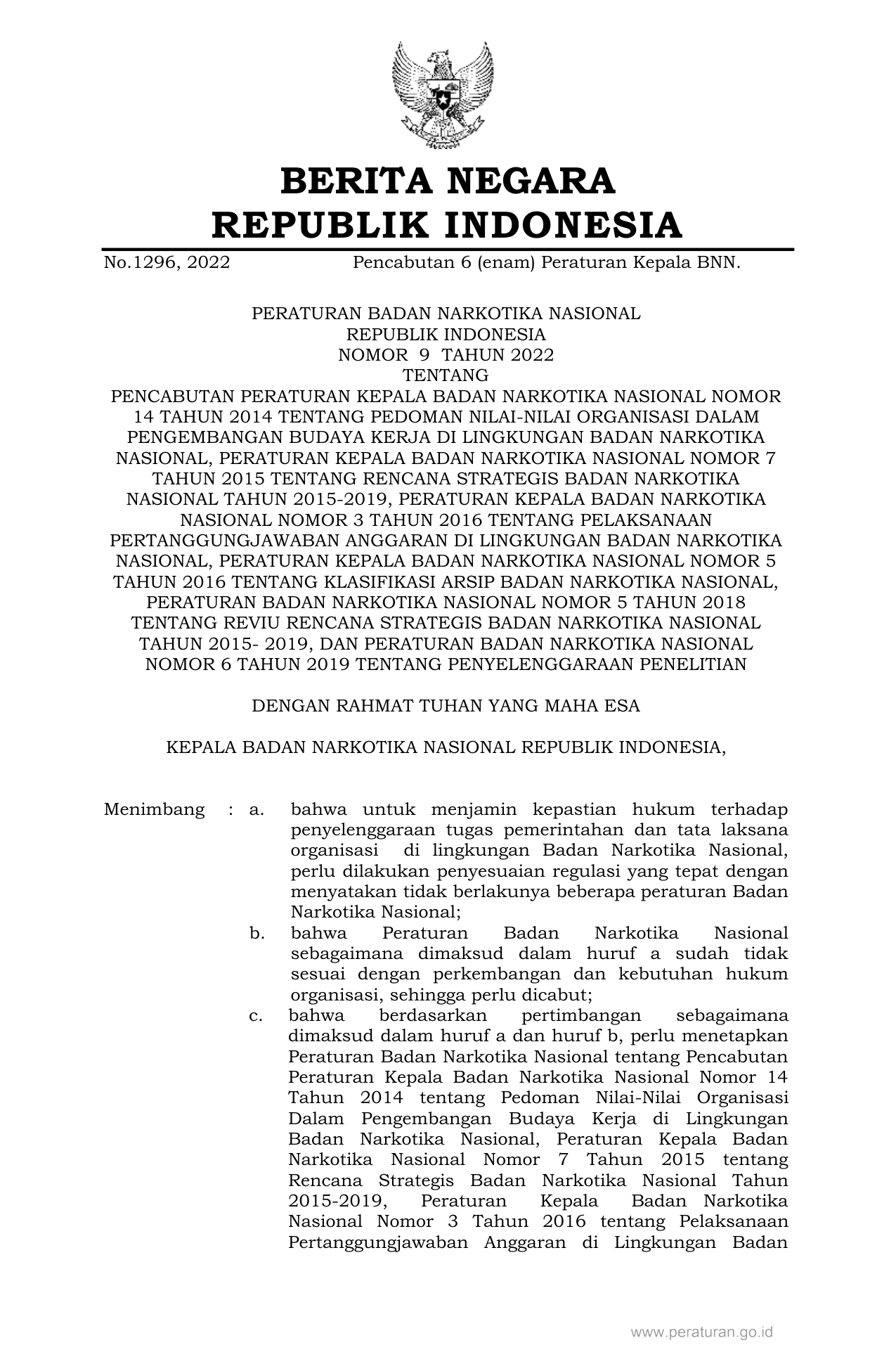 PERBAN Nomor 9 Tahun 2022 | Peraturan Badan Nomor 9 Tahun 2022 tentang PENCABUTAN PERATURAN KEPALA BADAN NARKOTIKA NASIONAL NOMOR 14 TAHUN 2014 TENTANG PEDOMAN NILAI-NILAI ORGANISASI DALAM PENGEMBANGAN BUDAYA KERJA DI LINGKUNGAN BADAN NARKOTIKA NASIONAL, PERATURAN KEPALA BADAN NARKOTIKA NASIONAL NOMOR 7 TAHUN 2015 TENTANG RENCANA STRATEGIS BADAN NARKOTIKA NASIONAL TAHUN 2015-2019, PERATURAN KEPALA BADAN NARKOTIKA NASIONAL NOMOR 3 TAHUN 2016 TENTANG PELAKSANAAN PERTANGGUNGJAWABAN ANGGARAN DI LINGKUNGAN BADAN NARKOTIKA NASIONAL, PERATURAN KEPALA BADAN NARKOTIKA NASIONAL NOMOR 5 TAHUN 2016 TENTANG KLASIFIKASI ARSIP BADAN NARKOTIKA NASIONAL, PERATURAN BADAN NARKOTIKA NASIONAL NOMOR 5 TAHUN 2018 TENTANG REVIU RENCANA STRATEGIS BADAN NARKOTIKA NASIONAL TAHUN 2015- 2019, DAN PERATURAN BADAN NARKOTIKA NASIONAL NOMOR 6 TAHUN 2019 TENTANG PENYELENGGARAAN PENELITIAN