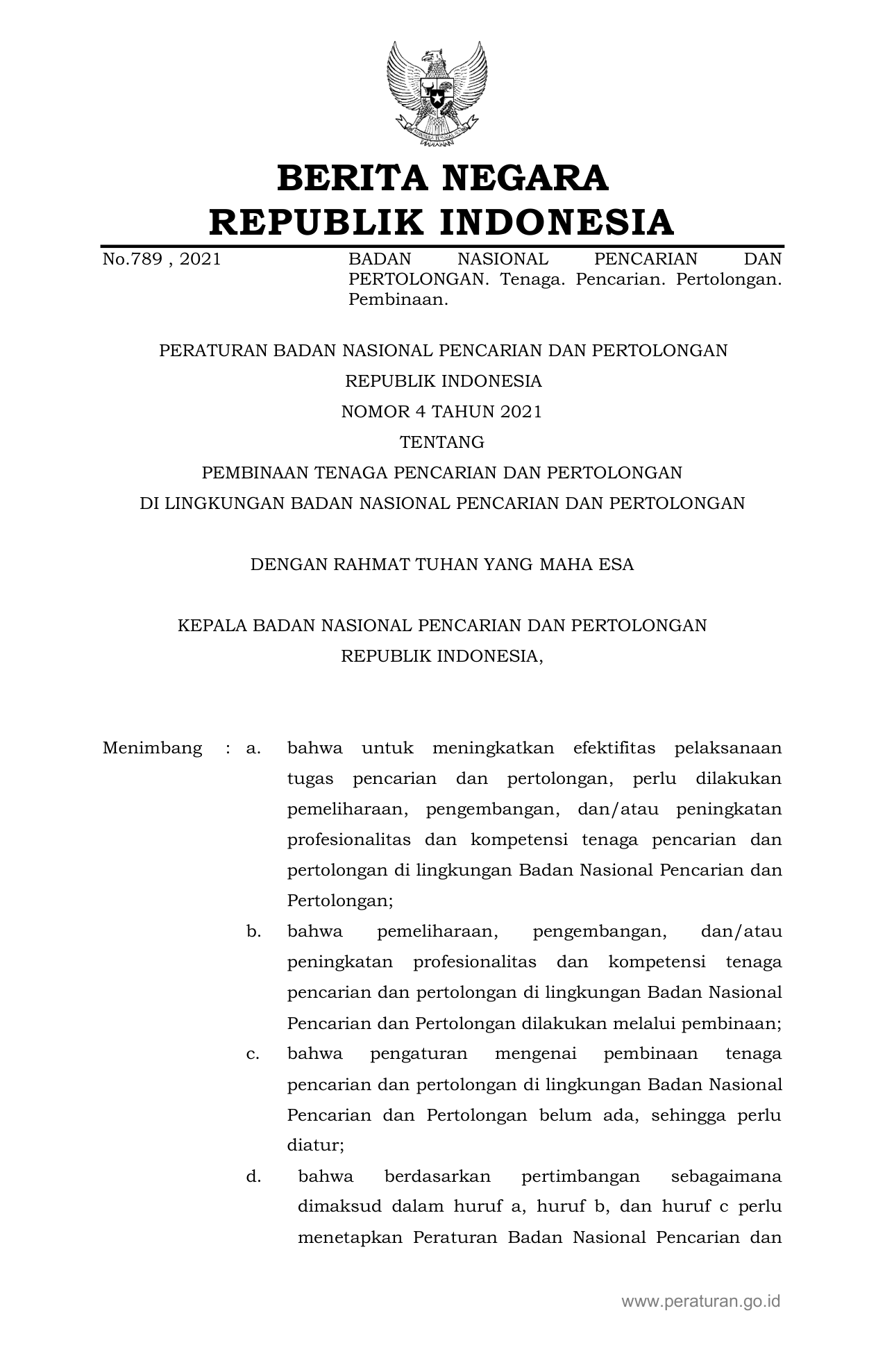PERBAN Nomor 4 Tahun 2021 | Peraturan Badan Nomor 4 Tahun 2021 tentang PEMBINAAN TENAGA PENCARIAN DAN PERTOLONGAN DI LINGKUNGAN BADAN NASIONAL PENCARIAN DAN PERTOLONGAN