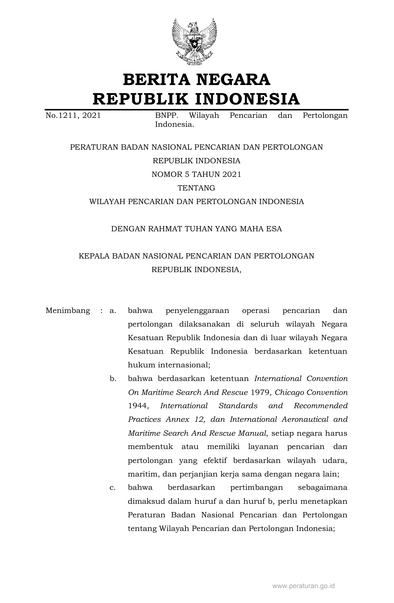 PERBAN Nomor 5 Tahun 2021 | Peraturan Badan Nomor 5 Tahun 2021 tentang WILAYAH PENCARIAN DAN PERTOLONGAN INDONESIA
