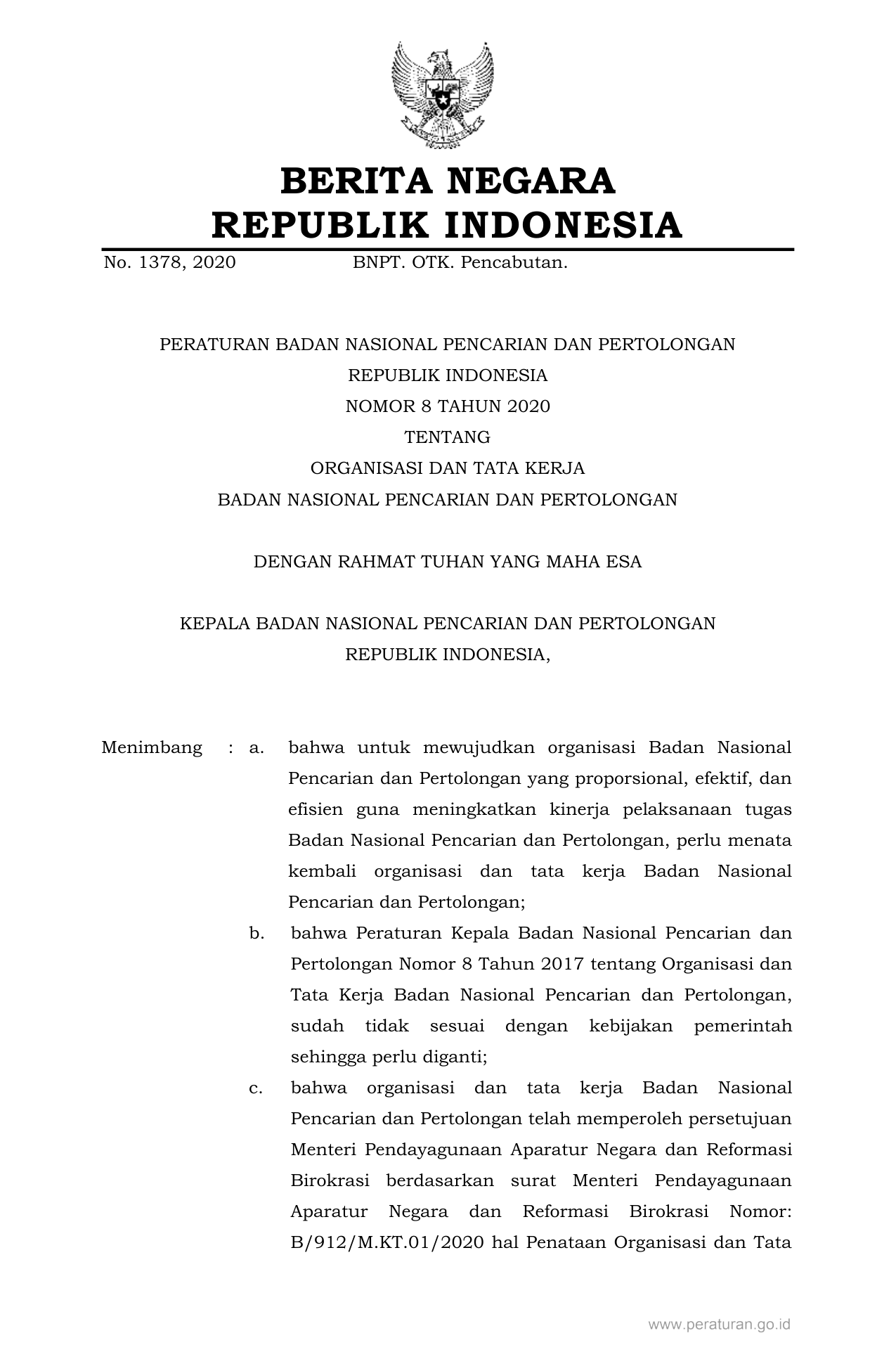 PERBAN Nomor 8 Tahun 2020 | Peraturan Badan Nomor 8 Tahun 2020 tentang ORGANISASI DAN TATA KERJA BADAN NASIONAL PENCARIAN DAN PERTOLONGAN