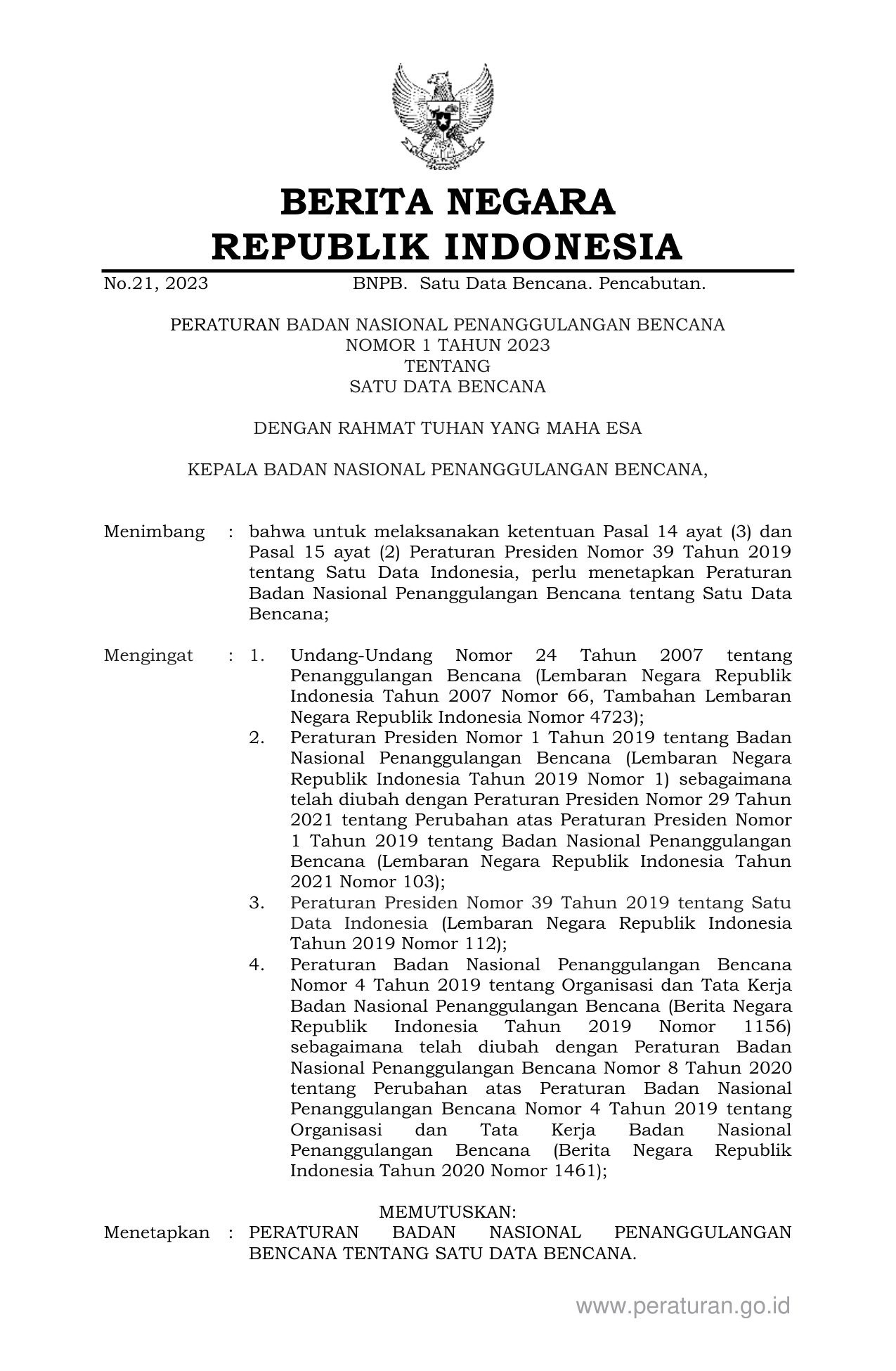 PERBAN Nomor 1 Tahun 2023 | Peraturan Badan Nomor 1 Tahun 2023 tentang SATU DATA BENCANA
