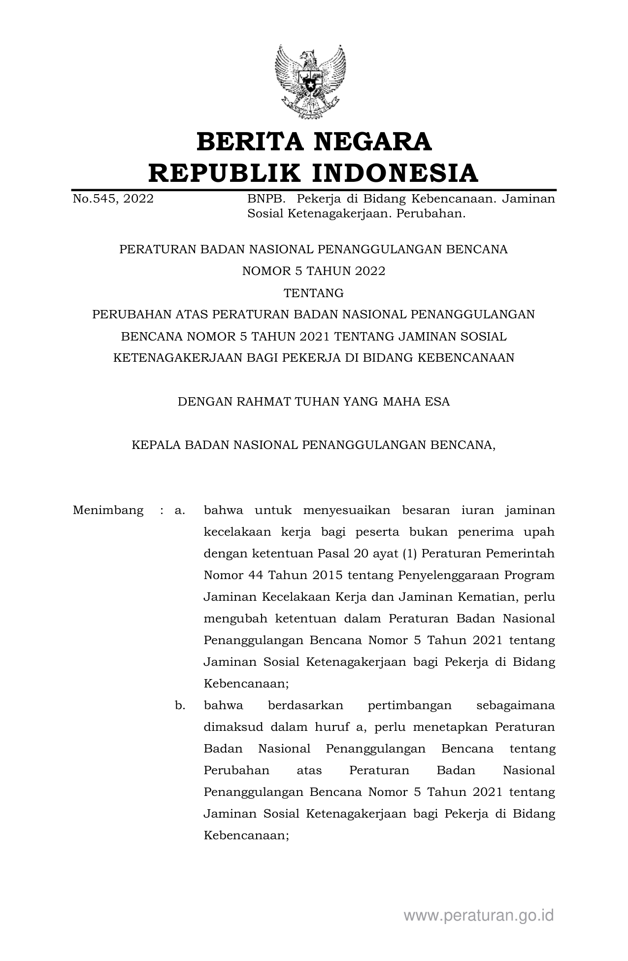 PERBAN Nomor 5 Tahun 2022 | Peraturan Badan Nomor 5 Tahun 2022 tentang PERUBAHAN ATAS PERATURAN BADAN NASIONAL PENANGGULANGAN BENCANA NOMOR 5 TAHUN 2021 TENTANG JAMINAN SOSIAL KETENAGAKERJAAN BAGI PEKERJA DI BIDANG KEBENCANAAN