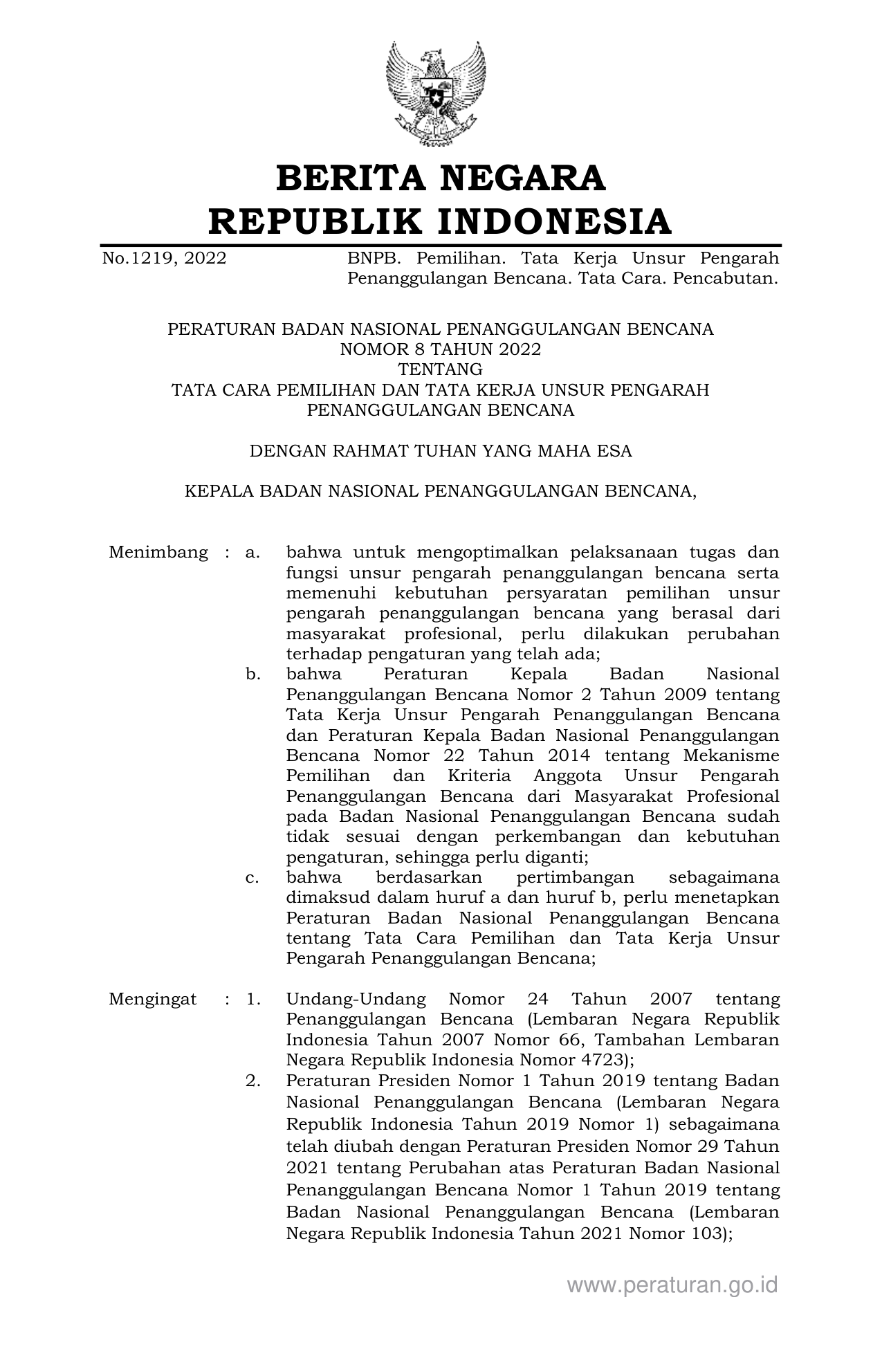 PERBAN Nomor 8 Tahun 2022 | Peraturan Badan Nomor 8 Tahun 2022 tentang TATA CARA PEMILIHAN DAN TATA KERJA UNSUR PENGARAH PENANGGULANGAN BENCANA