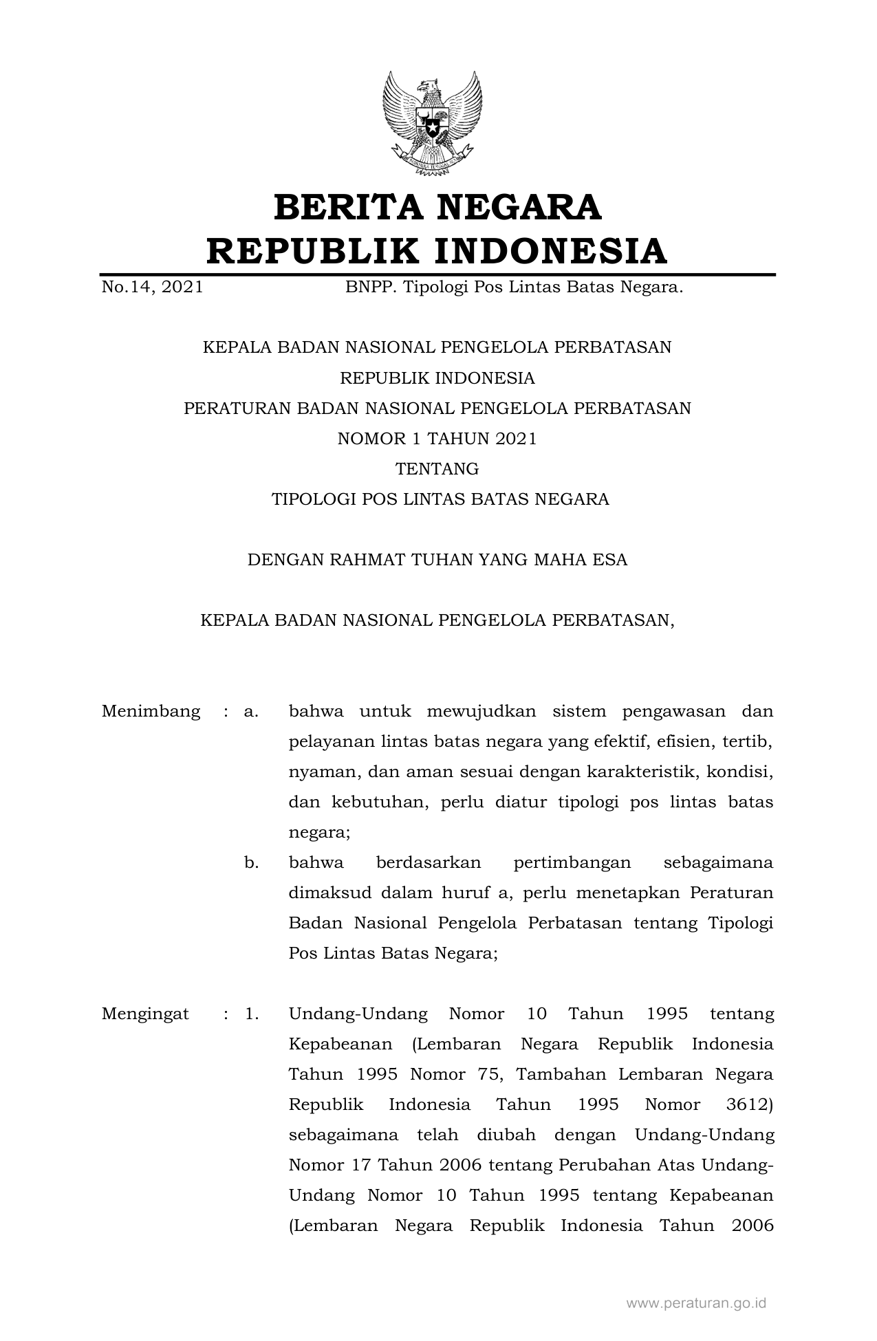 PERBAN Nomor 1 Tahun 2021 | Peraturan Badan Nomor 1 Tahun 2021 tentang TIPOLOGI POS LINTAS BATAS NEGARA