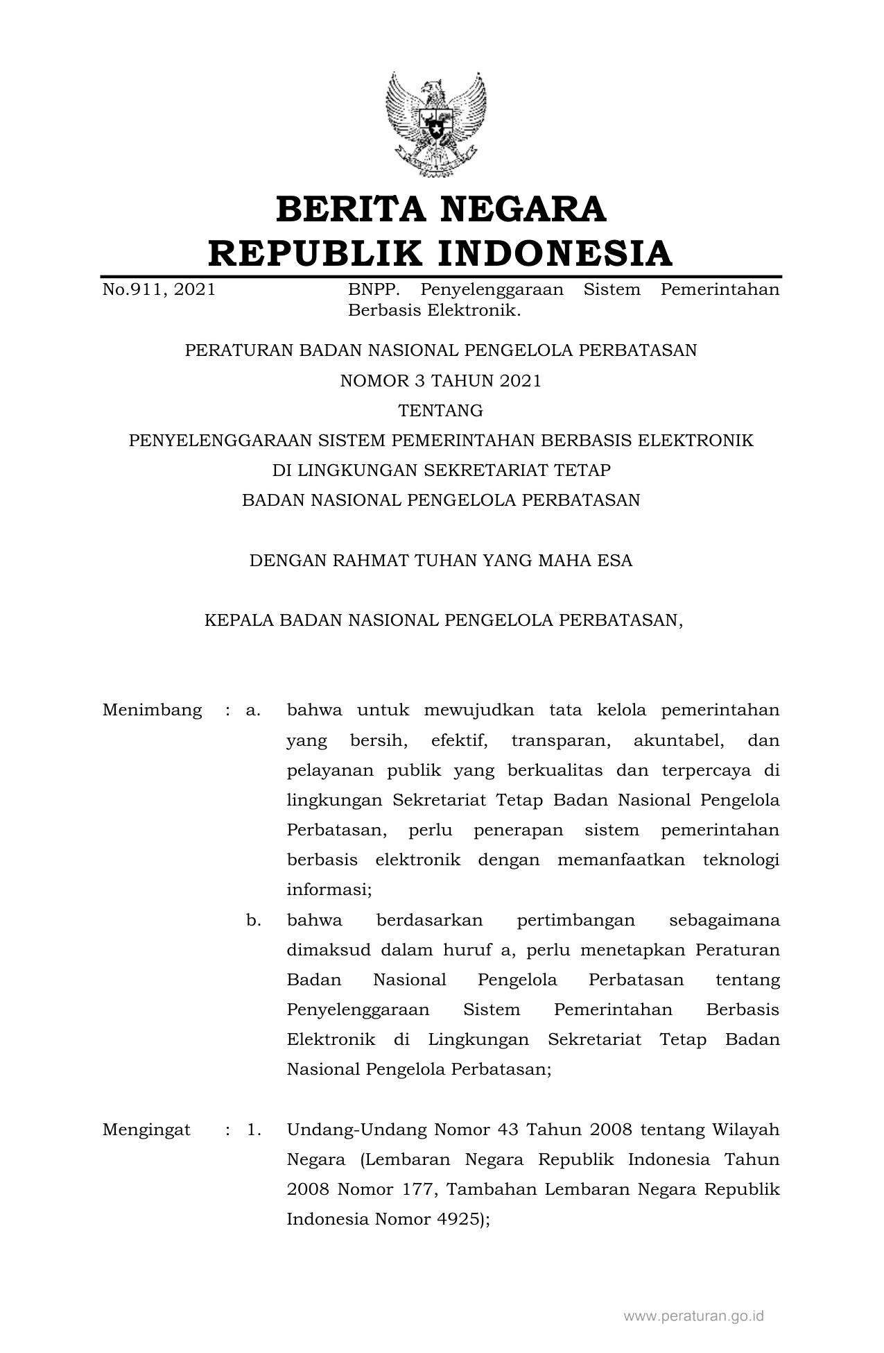 PERBAN Nomor 3 Tahun 2021 | Peraturan Badan Nomor 3 Tahun 2021 tentang PENYELENGGARAAN SISTEM PEMERINTAHAN BERBASIS ELEKTRONIK DI LINGKUNGAN SEKRETARIAT TETAP BADAN NASIONAL PENGELOLA PERBATASAN