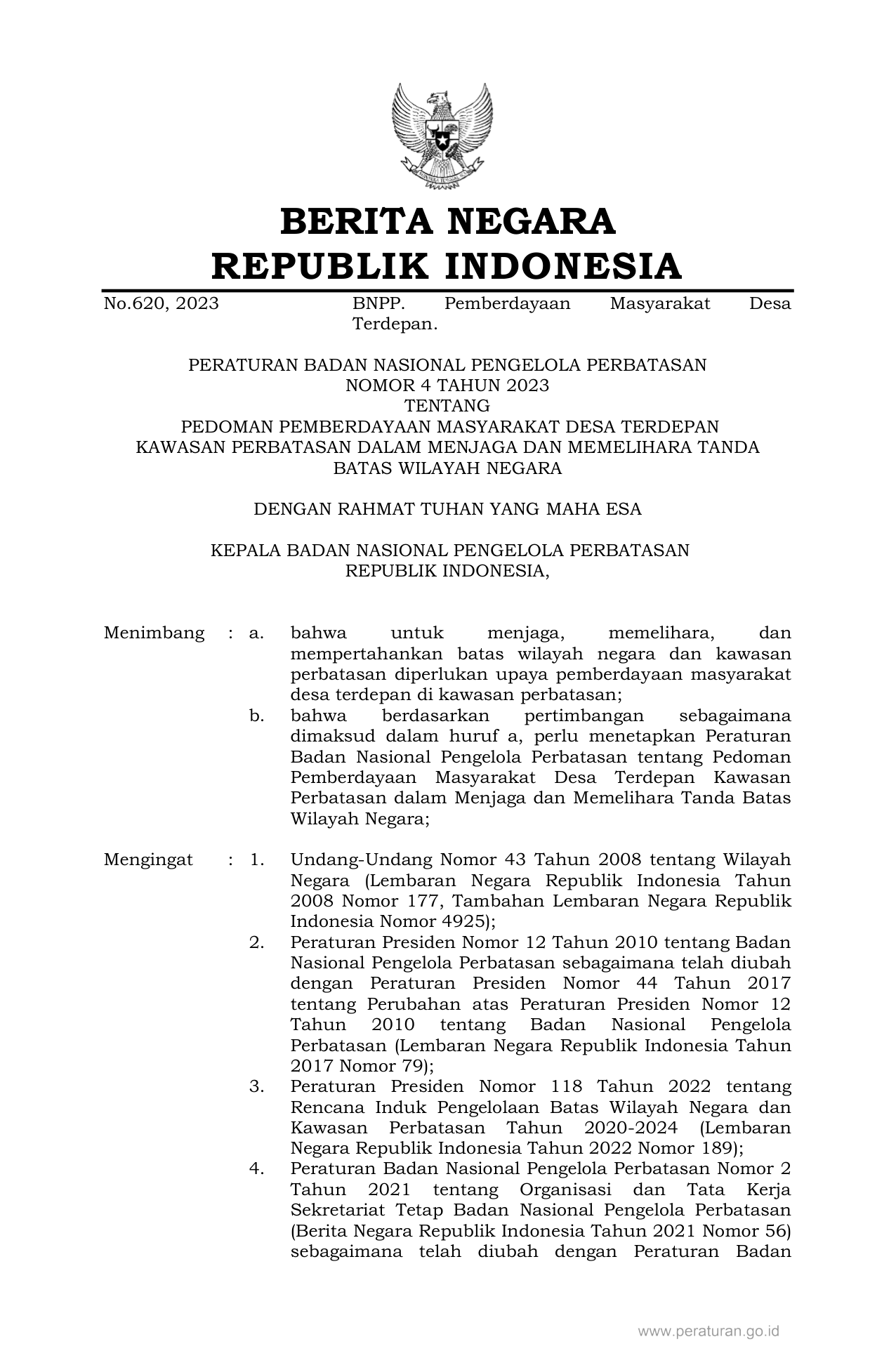 PERBAN Nomor 4 Tahun 2023 | Peraturan Badan Nomor 4 Tahun 2023 tentang PEDOMAN PEMBERDAYAAN MASYARAKAT DESA TERDEPAN KAWASAN PERBATASAN DALAM MENJAGA DAN MEMELIHARA TANDA BATAS WILAYAH NEGARA