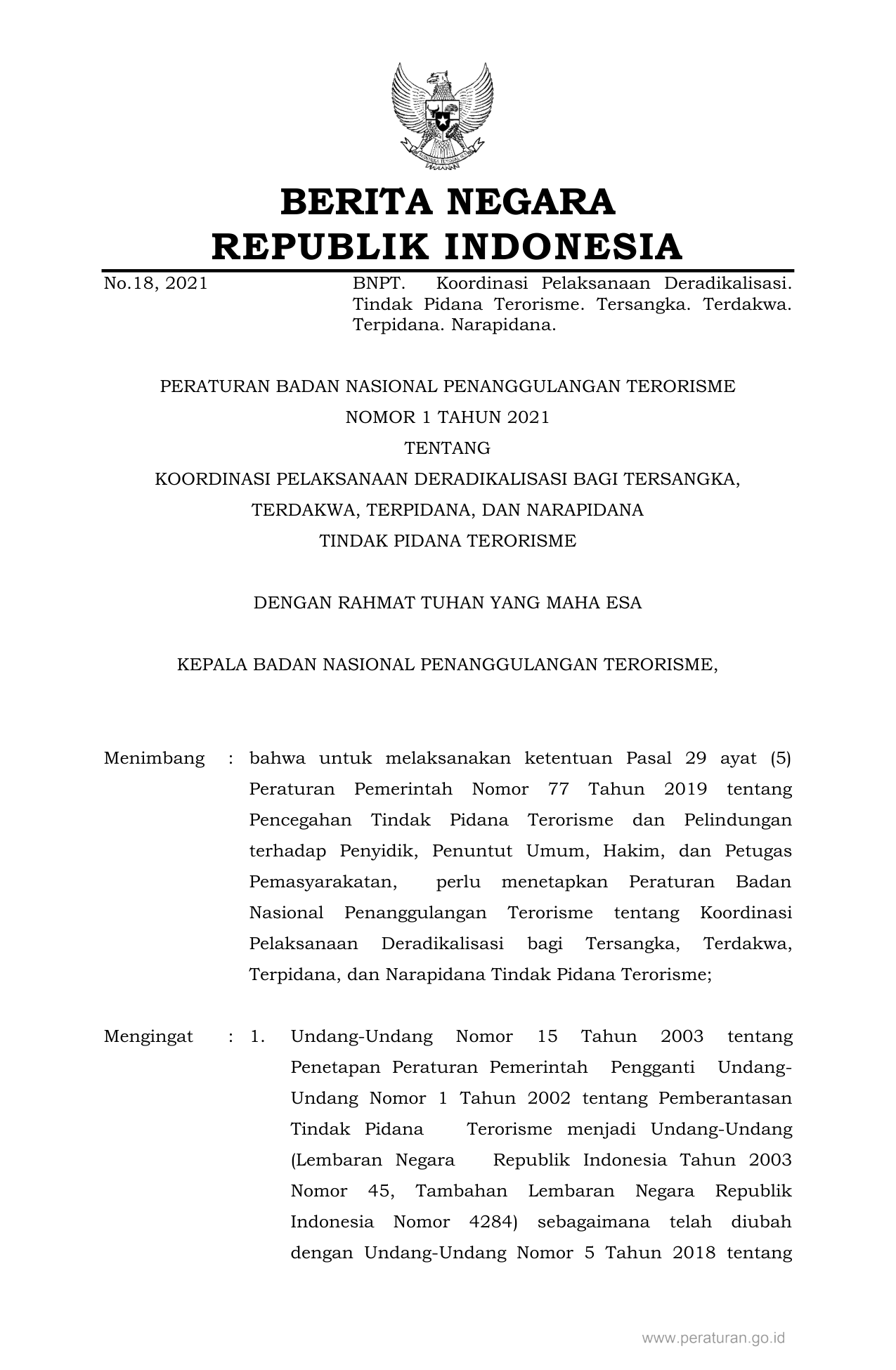 PERBAN Nomor 1 Tahun 2021 | Peraturan Badan Nomor 1 Tahun 2021 tentang KOORDINASI PELAKSANAAN DERADIKALISASI BAGI TERSANGKA, TERDAKWA, TERPIDANA, DAN NARAPIDANA TINDAK PIDANA TERORISME