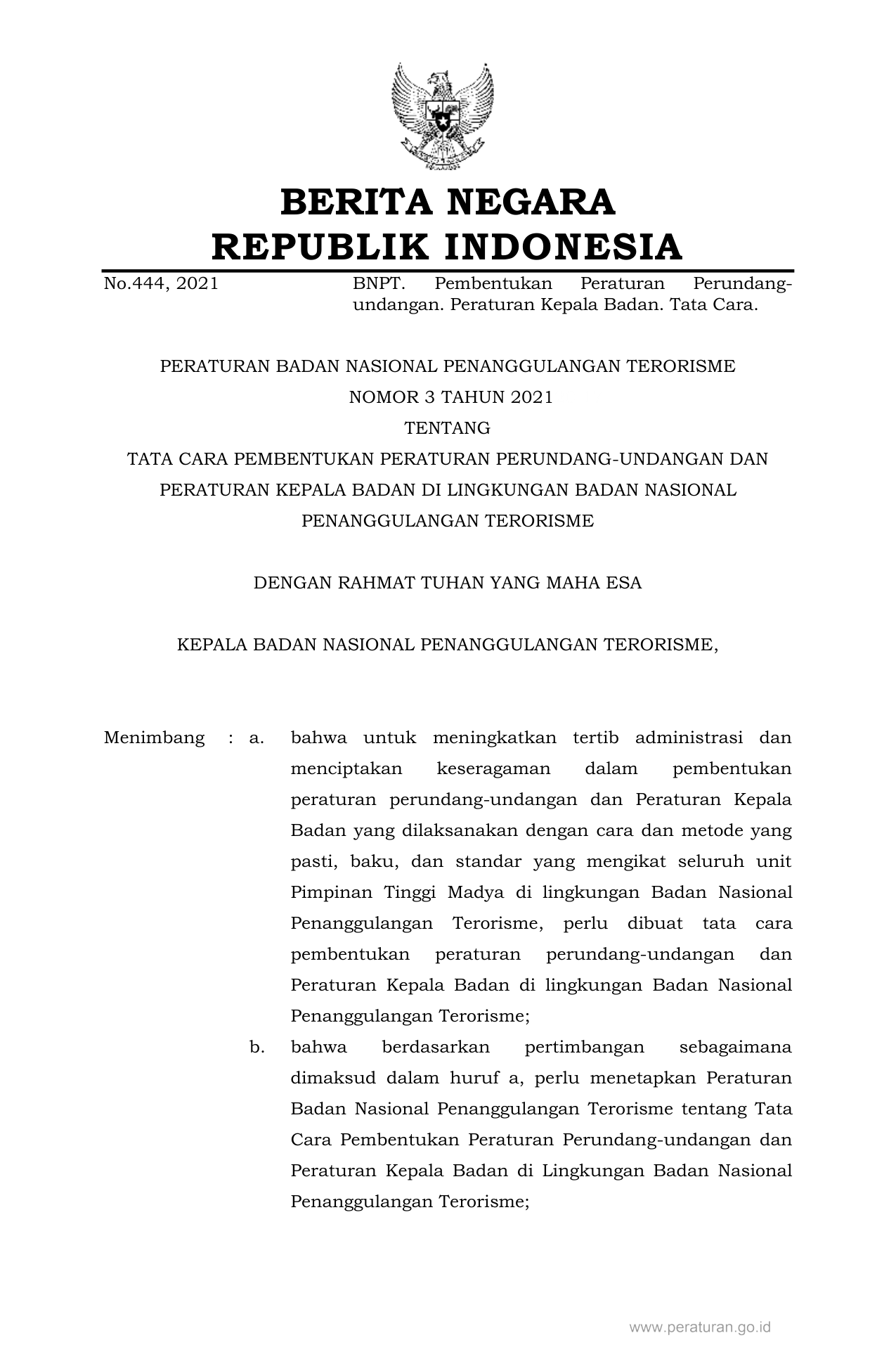 PERBAN Nomor 3 Tahun 2021 | Peraturan Badan Nomor 3 Tahun 2021 tentang TATA CARA PEMBENTUKAN PERATURAN PERUNDANG-UNDANGAN DAN PERATURAN KEPALA BADAN DI LINGKUNGAN BADAN NASIONAL PENANGGULANGAN TERORISME