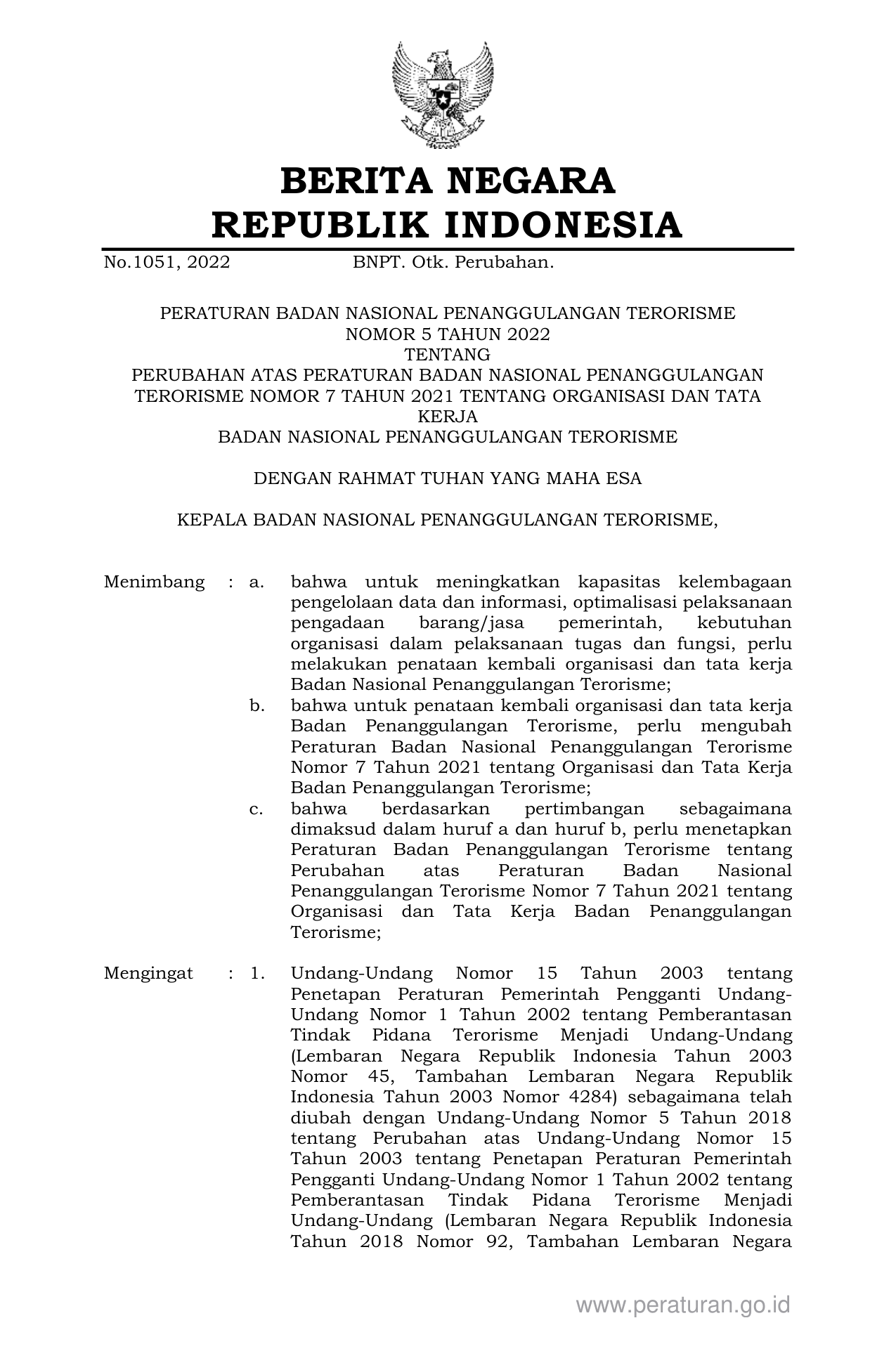 PERBAN Nomor 5 Tahun 2022 | Peraturan Badan Nomor 5 Tahun 2022 tentang PERUBAHAN ATAS PERATURAN BADAN NASIONAL PENANGGULANGAN TERORISME NOMOR 7 TAHUN 2021 TENTANG ORGANISASI DAN TATA KERJA BADAN NASIONAL PENANGGULANGAN TERORISME