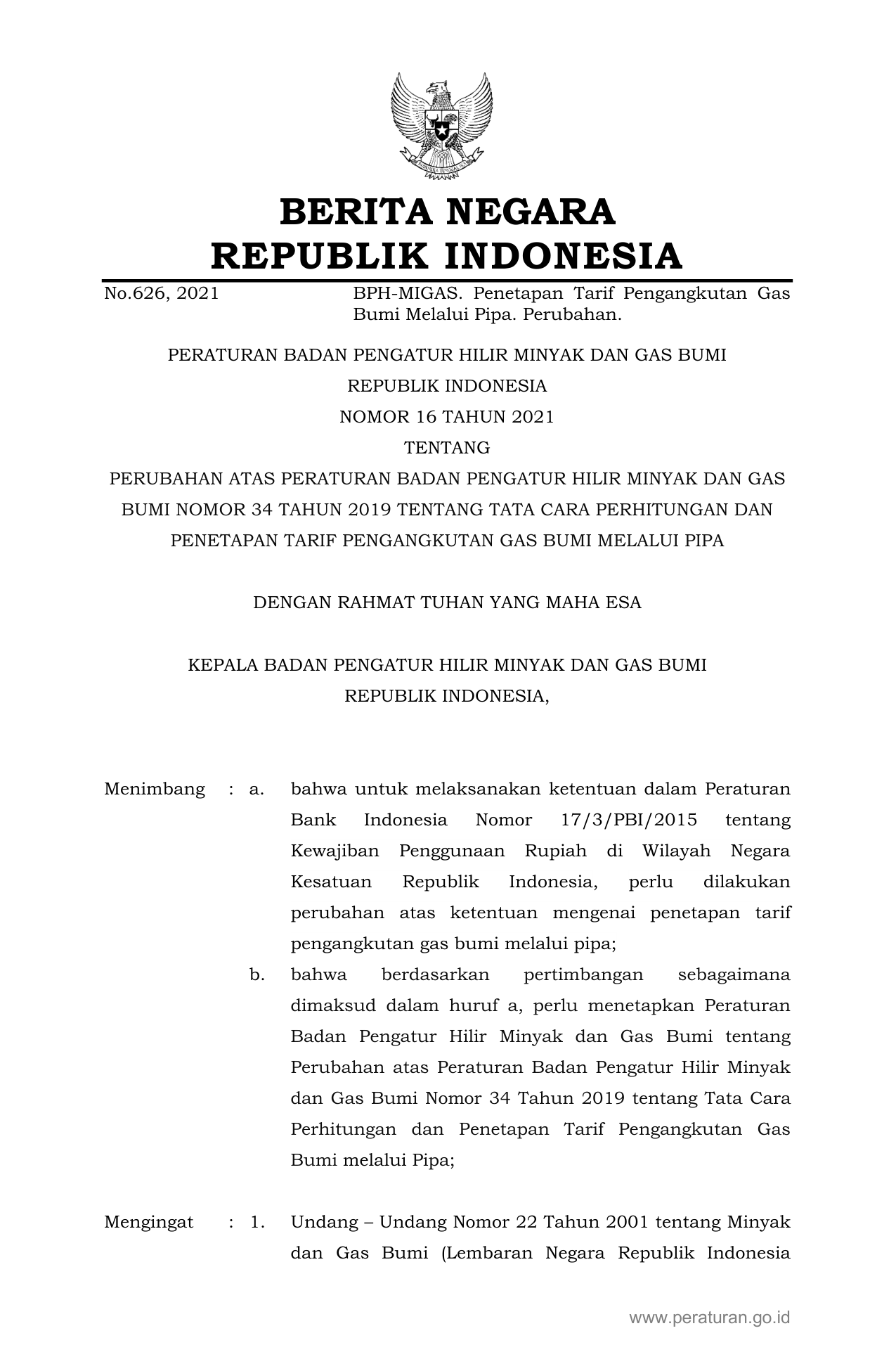 PERBAN Nomor 16 Tahun 2021 | Peraturan Badan Nomor 16 Tahun 2021 tentang PERUBAHAN ATAS PERATURAN BADAN PENGATUR HILIR MINYAK DAN GAS BUMI NOMOR 34 TAHUN 2019 TENTANG TATA CARA PERHITUNGAN DAN PENETAPAN TARIF PENGANGKUTAN GAS BUMI MELALUI PIPA