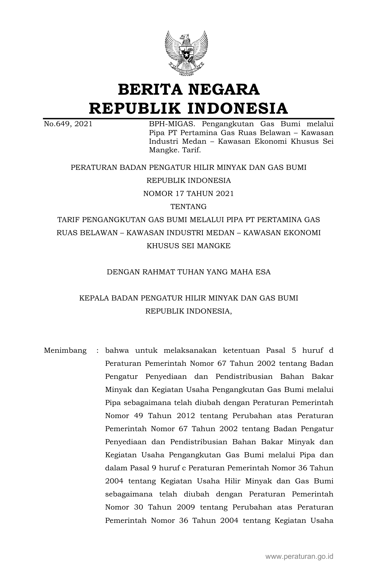 PERBAN Nomor 17 Tahun 2021 | Peraturan Badan Nomor 17 Tahun 2021 tentang TARIF PENGANGKUTAN GAS BUMI MELALUI PIPA PT PERTAMINA GAS RUAS BELAWAN – KAWASAN INDUSTRI MEDAN – KAWASAN EKONOMI KHUSUS SEI MANGKE