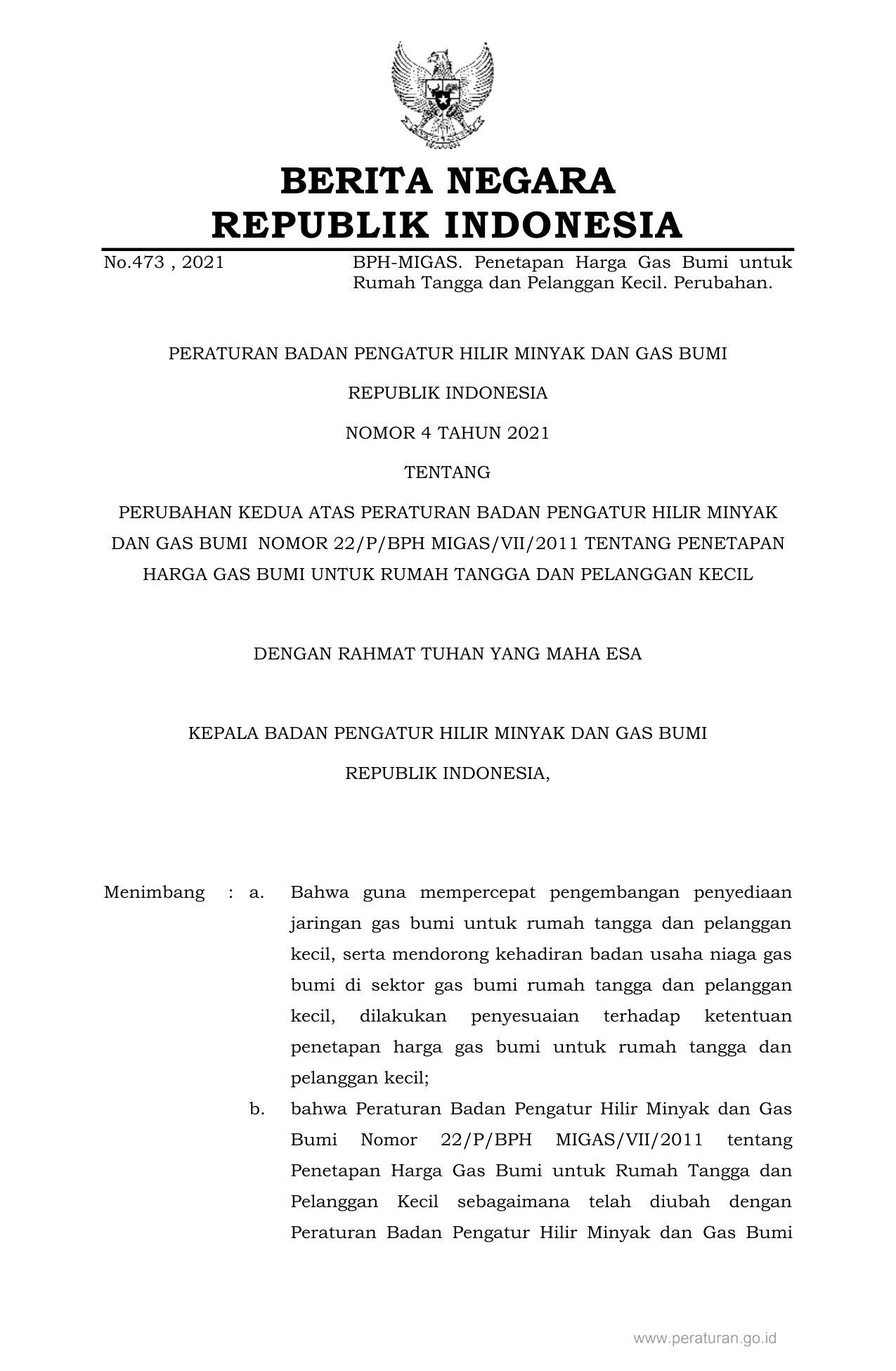 PERBAN Nomor 4 Tahun 2021 | Peraturan Badan Nomor 4 Tahun 2021 tentang PERUBAHAN KEDUA ATAS PERATURAN BADAN PENGATUR HILIR MINYAK DAN GAS BUMI NOMOR 22/P/BPH MIGAS/VII/2011 TENTANG PENETAPAN HARGA GAS BUMI UNTUK RUMAH TANGGA DAN PELANGGAN KECIL