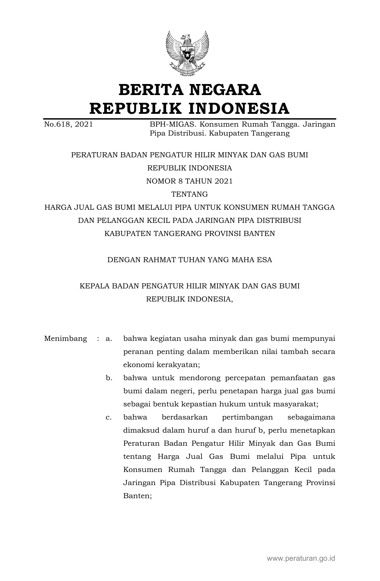 PERBAN Nomor 8 Tahun 2021 | Peraturan Badan Nomor 8 Tahun 2021 tentang HARGA JUAL GAS BUMI MELALUI PIPA UNTUK KONSUMEN RUMAH TANGGA DAN PELANGGAN KECIL PADA JARINGAN PIPA DISTRIBUSI KABUPATEN TANGERANG PROVINSI BANTEN