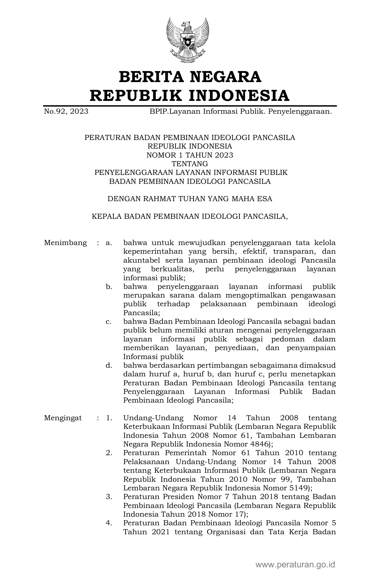 PERBAN Nomor 1 Tahun 2023 | Peraturan Badan Nomor 1 Tahun 2023 tentang PENYELENGGARAAN LAYANAN INFORMASI PUBLIK BADAN PEMBINAAN IDEOLOGI PANCASILA
