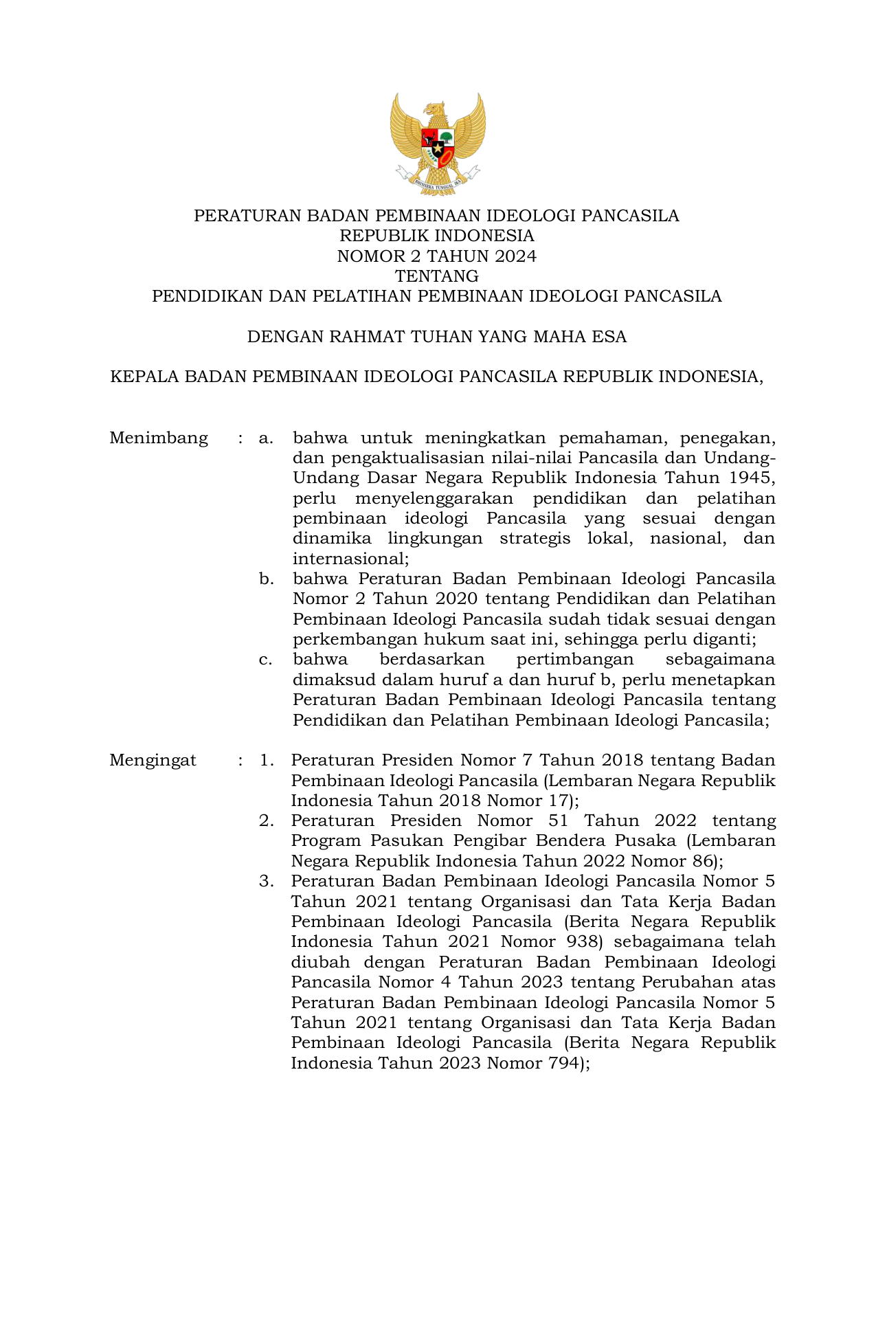 PERBAN Nomor 2 Tahun 2024 | Peraturan Badan Nomor 2 Tahun 2024 tentang PENDIDIKAN DAN PELATIHAN PEMBINAAN IDEOLOGI PANCASILA