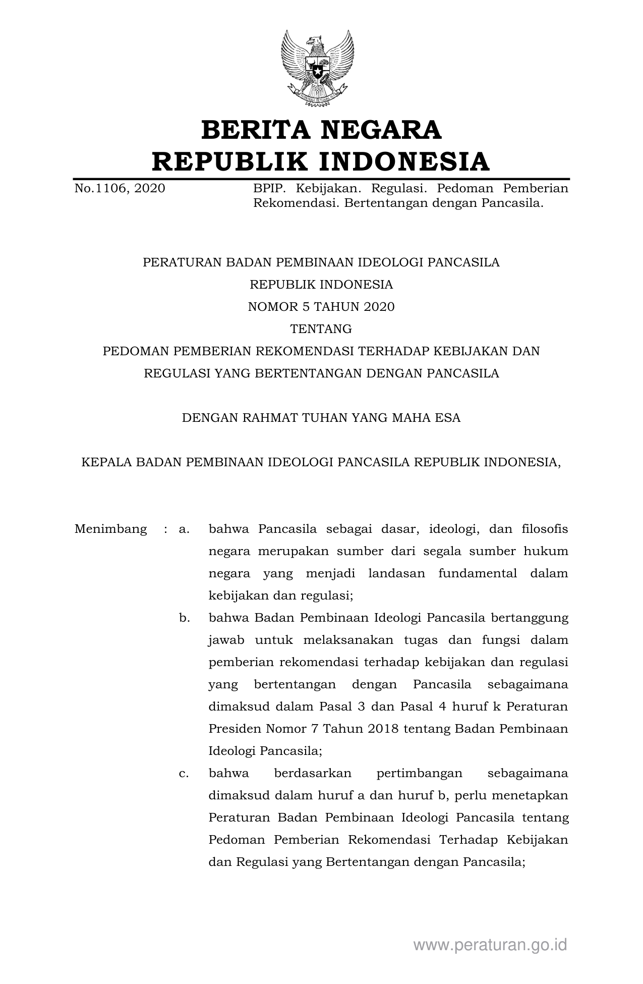PERBAN Nomor 5 Tahun 2020 | Peraturan Badan Nomor 5 Tahun 2020 tentang PEDOMAN PEMBERIAN REKOMENDASI TERHADAP KEBIJAKAN DAN REGULASI YANG BERTENTANGAN DENGAN PANCASILA
