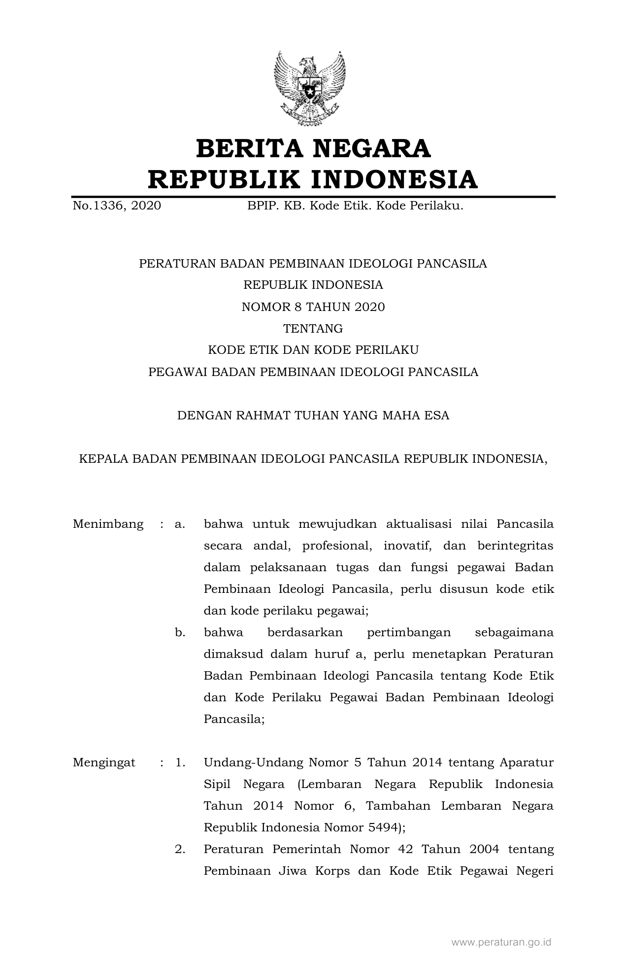 PERBAN Nomor 8 Tahun 2020 | Peraturan Badan Nomor 8 Tahun 2020 tentang KODE ETIK DAN KODE PERILAKU PEGAWAI BADAN PEMBINAAN IDEOLOGI PANCASILA