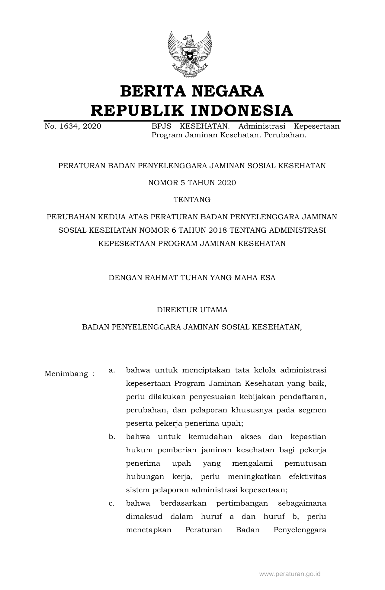 PERBAN Nomor 5 Tahun 2020 | Peraturan Badan Nomor 5 Tahun 2020 tentang PERUBAHAN KEDUA ATAS PERATURAN BADAN PENYELENGGARA JAMINAN SOSIAL KESEHATAN NOMOR 6 TAHUN 2018 TENTANG ADMINISTRASI KEPESERTAAN PROGRAM JAMINAN KESEHATAN