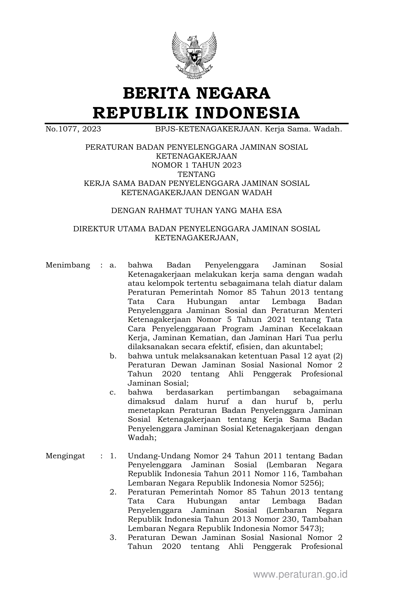 PERBAN Nomor 1 Tahun 2023 | Peraturan Badan Nomor 1 Tahun 2023 tentang KERJA SAMA BADAN PENYELENGGARA JAMINAN SOSIAL KETENAGAKERJAAN DENGAN WADAH