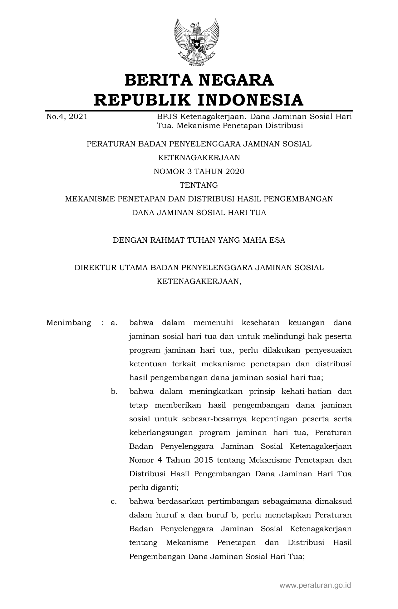 PERBAN Nomor 3 Tahun 2020 | Peraturan Badan Nomor 3 Tahun 2020 tentang MEKANISME PENETAPAN DAN DISTRIBUSI HASIL PENGEMBANGAN DANA JAMINAN SOSIAL HARI TUA