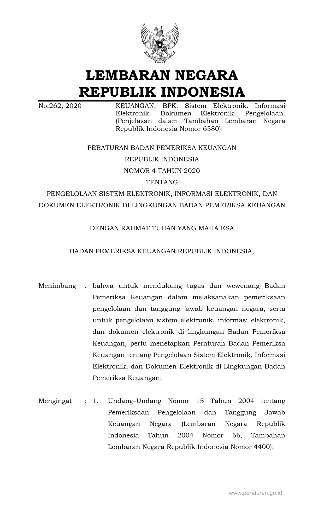 PERBAN Nomor 4 Tahun 2020 | Peraturan Badan Nomor 4 Tahun 2020 tentang PENGELOLAAN SISTEM ELEKTRONIK, INFORMASI ELEKTRONIK, DAN DOKUMEN ELEKTRONIK DI LINGKUNGAN BADAN PEMERIKSA KEUANGAN