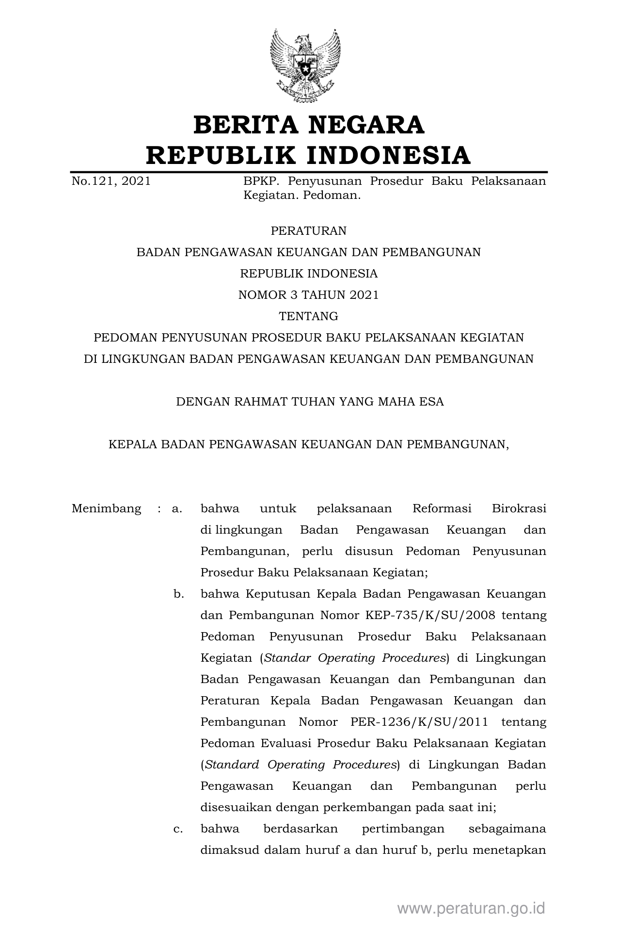 PERBAN Nomor 3 Tahun 2021 | Peraturan Badan Nomor 3 Tahun 2021 tentang PEDOMAN PENYUSUNAN PROSEDUR BAKU PELAKSANAAN KEGIATAN DI LINGKUNGAN BADAN PENGAWASAN KEUANGAN DAN PEMBANGUNAN